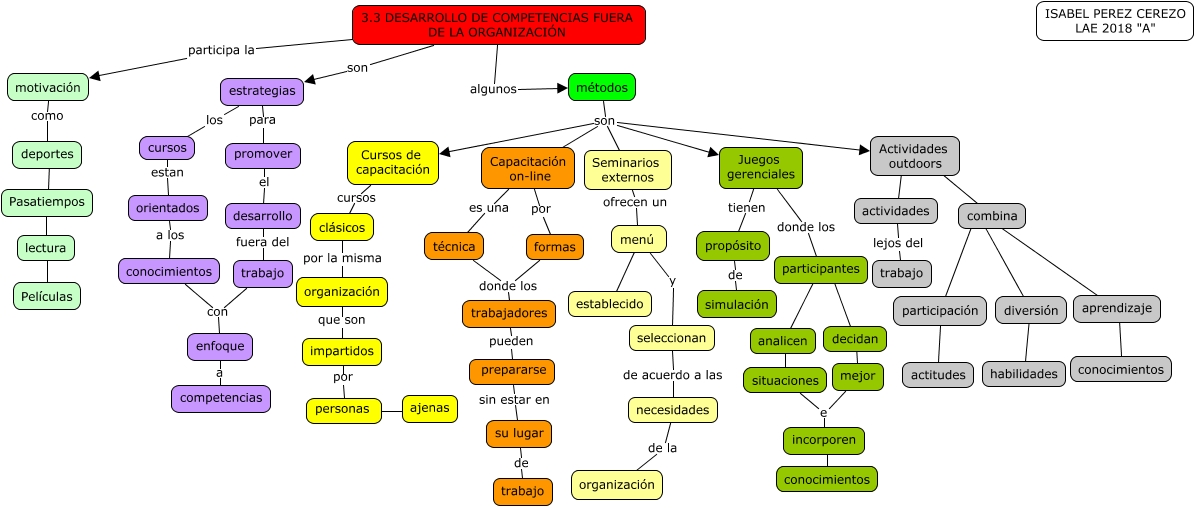 Este Cmap, tiene información relacionada con: 3.3 DESARROLLO DE COMPETENCIAS FUERA DE LA ORGANIZACIÓN, Juegos gerenciales donde los participantes, incorporen ???? conocimientos, cursos estan orientados, Actividades outdoors ???? actividades, métodos son Actividades outdoors, participantes ???? analicen, formas donde los trabajadores, Actividades outdoors ???? combina, 3.3 DESARROLLO DE COMPETENCIAS FUERA DE LA ORGANIZACIÓN algunos métodos, Seminarios externos ofrecen un menú, personas ???? ajenas, 3.3 DESARROLLO DE COMPETENCIAS FUERA DE LA ORGANIZACIÓN participa la motivación, métodos son Cursos de capacitación, menú ???? establecido, estrategias para promover, orientados a los conocimientos, técnica donde los trabajadores, participantes ???? decidan, prepararse sin estar en su lugar, impartidos por personas