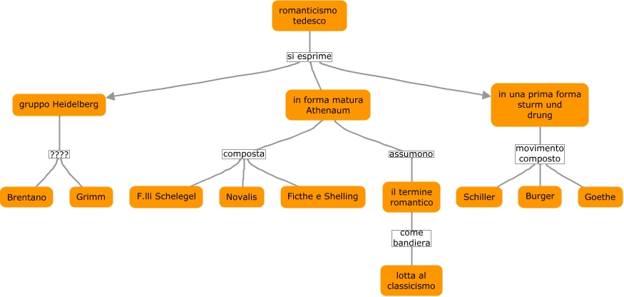 Questa Cmap, creata con IHMC CmapTools, contiene informazioni relative a: romanticismo tedesco, gruppo Heidelberg ???? Brentano, in forma matura Athenaum composta F.lli Schelegel, in una prima forma sturm und drung movimento composto Burger, romanticismo tedesco si esprime in una prima forma sturm und drung, il termine romantico come bandiera lotta al classicismo, in una prima forma sturm und drung movimento composto Schiller, romanticismo tedesco si esprime in forma matura Athenaum, gruppo Heidelberg ???? Grimm, romanticismo tedesco si esprime gruppo Heidelberg, in una prima forma sturm und drung movimento composto Goethe, in forma matura Athenaum composta Novalis, in forma matura Athenaum assumono il termine romantico, in forma matura Athenaum composta Ficthe e Shelling
