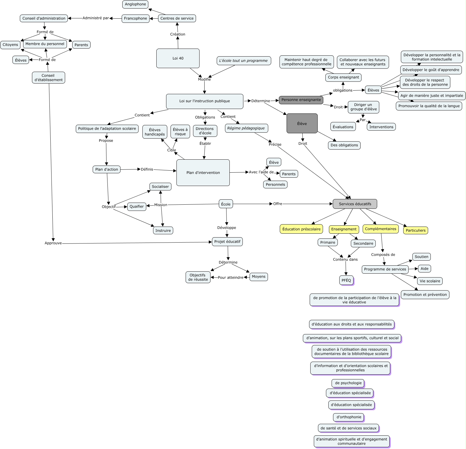 Cette carte de concepts créée avec IHMC CmapTools traite de: test 3, Corps enseignant Collaborer avec les futurs et nouveaux enseignants, Plan d'action Objectif Socialiser, Services éducatifs Particuliers, Loi sur l'instruction publique Détermine Élève, École Mission Socialiser, Centres de service Francophone, Conseil d'administration Formé de Parents, Loi sur l'instruction publique Détermine Personne enseignante, Conseil d'administration Formé de Citoyens, Plan d'action Objectif Quaifier, L'école tout un programme Modifie Loi sur l'instruction publique, Programme de services Vie scolaire, Diriger un groupe d'élève Par Évaluations, Élèves Développer le respect des droits de la personne, Conseil d'administration Formé de Membre du personnel, Conseil d'établissement Formé de Élèves, Plan d'intervention Avec l'aide de Personnels, École Mission Instruire, Loi sur l'instruction publique Obligations Directions d'école, Politique de l'adaptation scolaire Propose Plan d'action
