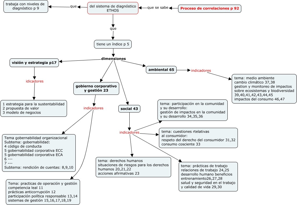 Este Cmap, tiene información relacionada con: Correlaciones de RS entre indicadores ETHOS, GRI, ISO26000, tiene un índice p 5 dimensiones visión y estrategia p17, gobierno corporativo y gestión 23 indicadores Tema gobernabilidad organizacional Subtema: gobernabilidad: 4 código de conducta 5 gobernabilidad corporativa ECC 5 gobernabilidad corporativa ECA 6 --- 7 --- Subtema: rendición de cuentas: 8,9,10, social 43 indicadores tema: cuestiones rtelativas al consumidor: respeto del derecho del consumidor 31,32 consumo cosciente 33, del sistema de diagnóstico ETHOS que tiene un índice p 5, visión y estrategia p17 idicadores 1 estrategia para la sustentabilidad 2 propuesta de valor 3 modelo de negocios, del sistema de diagnóstico ETHOS que trabaja con niveles de diagnóstico p 9, tiene un índice p 5 dimensiones gobierno corporativo y gestión 23, tiene un índice p 5 dimensiones ambiental 65, tiene un índice p 5 dimensiones social 43, social 43 indicadores tema: derechos humanos situaciones de riesgos para los derechos humanos 20,21,22 acciones afirmativas 23, Proceso de correlaciones p 92 que se sabe del sistema de diagnóstico ETHOS, social 43 indicadores tema: prácticas de trabajo relaciones de trabajo 24,25 desarrollo humano beneficios entrenamiento26,27,28 salud y seguridad en el trabajo y calidad de vida 29,30, ambiental 65 indicadores tema: medio ambiente cambio climático 37,38 gestion y monitoreo de impactos sobre ecosistemas y biodiversidad 39,40,41,42,43,44,45 impactos del consumo 46,47, gobierno corporativo y gestión 23 indicadores Tema: practicas de operación y gestión competencia leal 11 prácticas anticorrupción 12 participación política responsable 13,14 sistemas de gestión 15,16,17,18,19, social 43 indicadores tema: participación en la comunidad y su desarrollo: gestión de impactos en la comunidad y su desarrollo 34,35,36