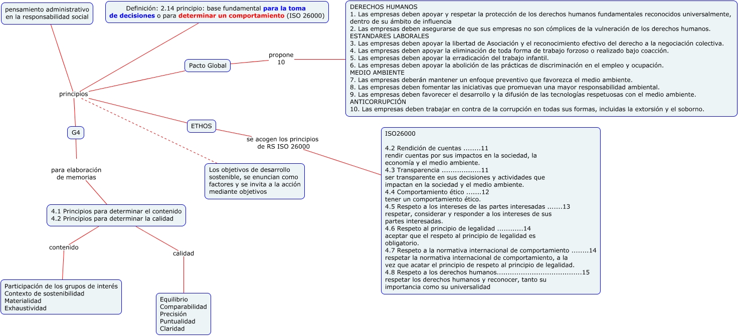 Este Cmap, tiene información relacionada con: El pensamiento administrativo en la RS - PRINCIPIOS, pensamiento administrativo en la responsabilidad social principios ETHOS, G4 para elaboración de memorias 4.1 Principios para determinar el contenido 4.2 Principios para determinar la calidad, 4.1 Principios para determinar el contenido 4.2 Principios para determinar la calidad calidad Equilibrio Comparabilidad Precisión Puntualidad Claridad, pensamiento administrativo en la responsabilidad social principios G4, pensamiento administrativo en la responsabilidad social principios Definición: 2.14 principio: base fundamental para la toma de decisiones o para determinar un comportamiento (ISO 26000), ETHOS se acogen los principios de RS ISO 26000 ISO26000 4.2 Rendición de cuentas ........11 rendir cuentas por sus impactos en la sociedad, la economía y el medio ambiente. 4.3 Transparencia ..................11 ser transparente en sus decisiones y actividades que impactan en la sociedad y el medio ambiente. 4.4 Comportamiento ético .......12 tener un comportamiento ético. 4.5 Respeto a los intereses de las partes interesadas .......13 respetar, considerar y responder a los intereses de sus partes interesadas. 4.6 Respeto al principio de legalidad ............14 aceptar que el respeto al principio de legalidad es obligatorio. 4.7 Respeto a la normativa internacional de comportamiento ........14 respetar la normativa internacional de comportamiento, a la vez que acatar el principio de respeto al principio de legalidad. 4.8 Respeto a los derechos humanos.......................................15 respetar los derechos humanos y reconocer, tanto su importancia como su universalidad, Pacto Global propone 10 DERECHOS HUMANOS 1. Las empresas deben apoyar y respetar la protección de los derechos humanos fundamentales reconocidos universalmente, dentro de su ámbito de influencia 2. Las empresas deben asegurarse de que sus empresas no son cómplices de la vulneración de los derechos humanos. ESTANDARES LABORALES 3. Las empresas deben apoyar la libertad de Asociación y el reconocimiento efectivo del derecho a la negociación colectiva. 4. Las empresas deben apoyar la eliminación de toda forma de trabajo forzoso o realizado bajo coacción. 5. Las empresas deben apoyar la erradicación del trabajo infantil. 6. Las empresas deben apoyar la abolición de las prácticas de discriminación en el empleo y ocupación. MEDIO AMBIENTE 7. Las empresas deberán mantener un enfoque preventivo que favorezca el medio ambiente. 8. Las empresas deben fomentar las iniciativas que promuevan una mayor responsabilidad ambiental. 9. Las empresas deben favorecer el desarrollo y la difusión de las tecnologías respetuosas con el medio ambiente. ANTICORRUPCIÓN 10. Las empresas deben trabajar en contra de la corrupción en todas sus formas, incluidas la extorsión y el soborno., 4.1 Principios para determinar el contenido 4.2 Principios para determinar la calidad contenido Participación de los grupos de interés Contexto de sostenibilidad Materialidad Exhaustividad, pensamiento administrativo en la responsabilidad social principios Los objetivos de desarrollo sostenible, se enuncian como factores y se invita a la acción mediante objetivos, pensamiento administrativo en la responsabilidad social principios Pacto Global
