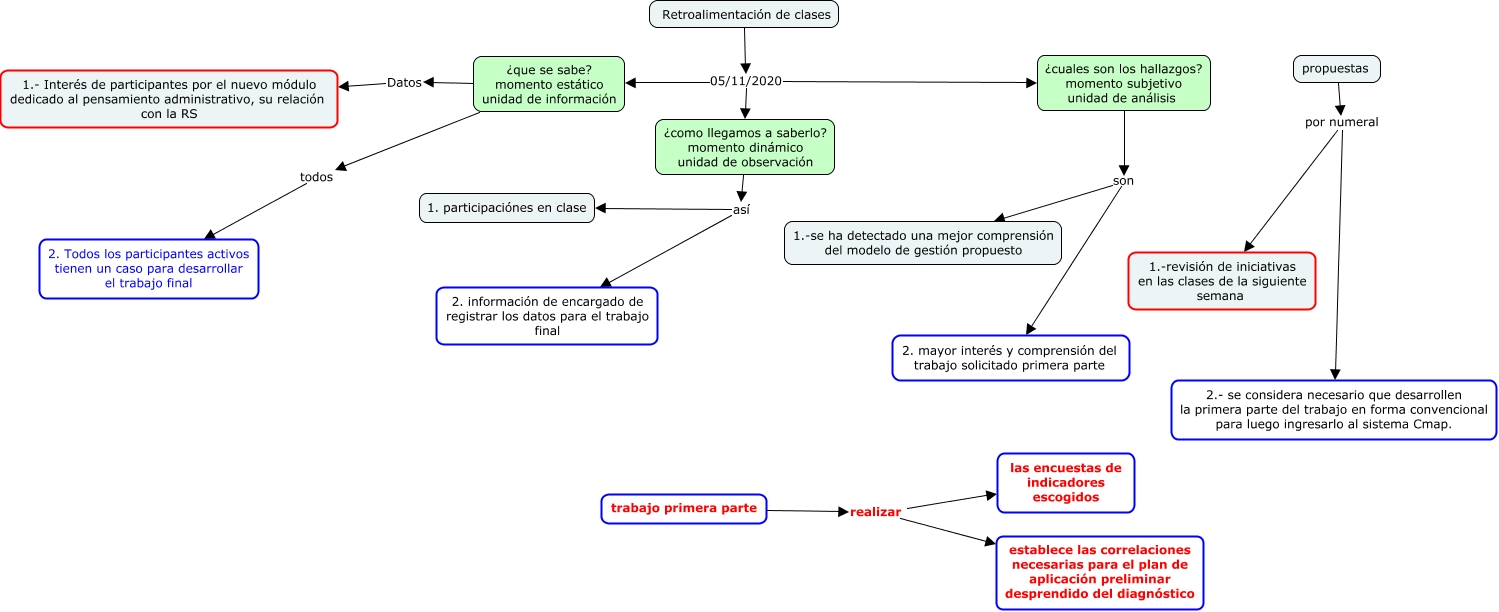 Este Cmap, tiene información relacionada con: Retroalimentación clases 05 de noviembre 2020, Retroalimentación de clases 05/11/2020 ¿como llegamos a saberlo? momento dinámico unidad de observación, ¿cuales son los hallazgos? momento subjetivo unidad de análisis son 1.-se ha detectado una mejor comprensión del modelo de gestión propuesto, propuestas por numeral 2.- se considera necesario que desarrollen la primera parte del trabajo en forma convencional para luego ingresarlo al sistema Cmap., ¿cuales son los hallazgos? momento subjetivo unidad de análisis son 2. mayor interés y comprensión del trabajo solicitado primera parte, trabajo primera parte realizar las encuestas de indicadores escogidos, ¿que se sabe? momento estático unidad de información Datos 1.- Interés de participantes por el nuevo módulo dedicado al pensamiento administrativo, su relación con la RS, trabajo primera parte realizar establece las correlaciones necesarias para el plan de aplicación preliminar desprendido del diagnóstico, Retroalimentación de clases 05/11/2020 ¿que se sabe? momento estático unidad de información, ¿como llegamos a saberlo? momento dinámico unidad de observación así 1. participaciónes en clase, ¿como llegamos a saberlo? momento dinámico unidad de observación así 2. información de encargado de registrar los datos para el trabajo final, Retroalimentación de clases 05/11/2020 ¿cuales son los hallazgos? momento subjetivo unidad de análisis, propuestas por numeral 1.-revisión de iniciativas en las clases de la siguiente semana, ¿que se sabe? momento estático unidad de información todos 2. Todos los participantes activos tienen un caso para desarrollar el trabajo final