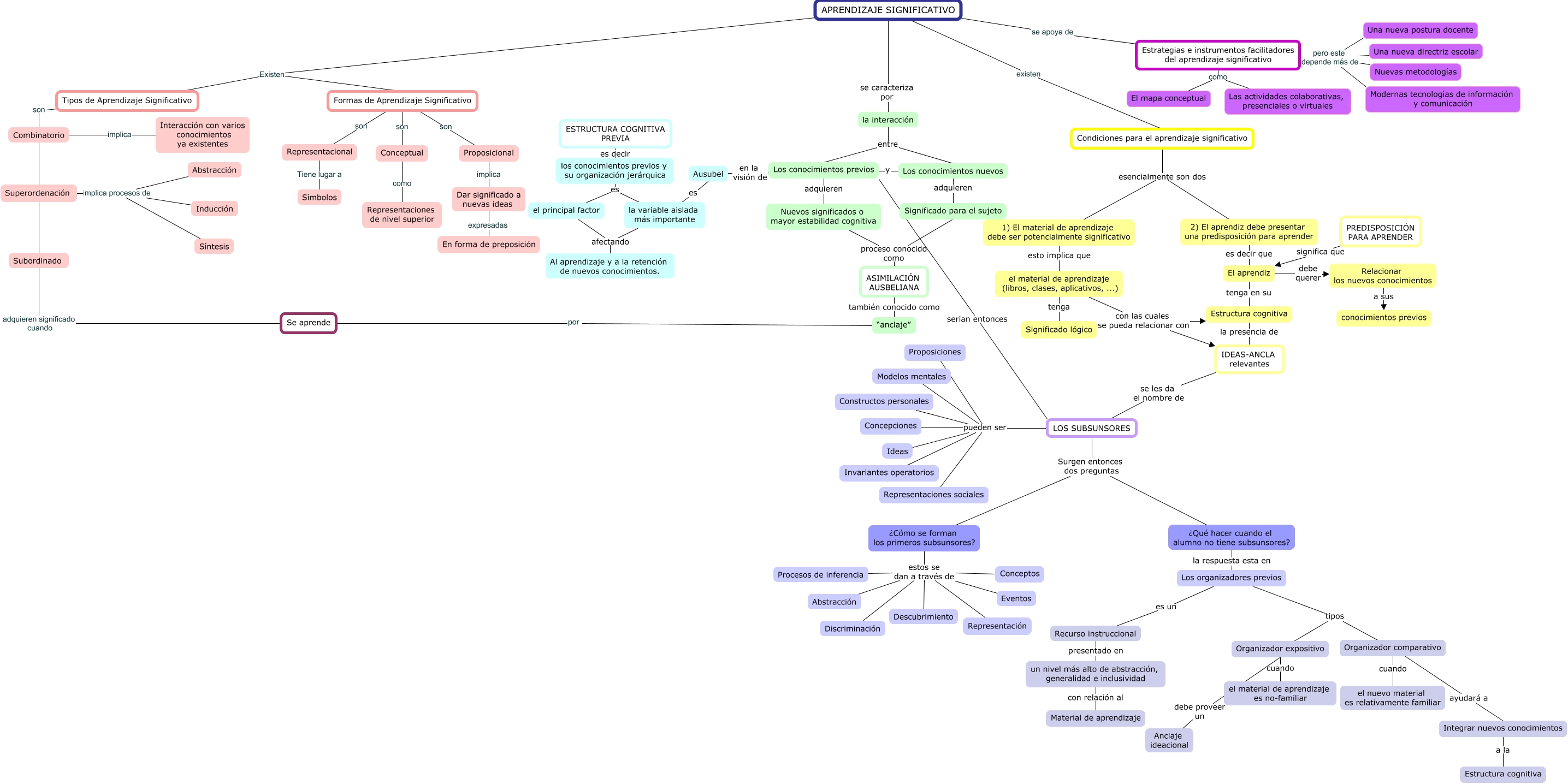 Este Cmap, tiene información relacionada con: APRENDIZAJE SIGNIFICATIVO, los conocimientos previos y su organización jerárquica es la variable aislada más importante, LOS SUBSUNSORES pueden ser Proposiciones, Dar significado a nuevas ideas expresadas En forma de preposición, la variable aislada más importante afectando Al aprendizaje y a la retención de nuevos conocimientos., 2) El aprendiz debe presentar una predisposición para aprender es decir que El aprendiz, LOS SUBSUNSORES pueden ser Invariantes operatorios, APRENDIZAJE SIGNIFICATIVO se caracteriza por la interacción, Los conocimientos nuevos adquieren Significado para el sujeto, ¿Cómo se forman los primeros subsunsores? estos se dan a través de Abstracción, LOS SUBSUNSORES pueden ser Constructos personales, LOS SUBSUNSORES pueden ser Ideas, Recurso instruccional presentado en un nivel más alto de abstracción, generalidad e inclusividad, PREDISPOSICIÓN PARA APRENDER significa que El aprendiz, Los organizadores previos es un Recurso instruccional, Estrategias e instrumentos facilitadores del aprendizaje significativo pero este depende más de Modernas tecnologías de información y comunicación, 1) El material de aprendizaje debe ser potencialmente significativo esto implica que el material de aprendizaje (libros, clases, aplicativos, ...), Tipos de Aprendizaje Significativo son Subordinado, Organizador expositivo debe proveer un Anclaje ideacional, IDEAS-ANCLA relevantes se les da el nombre de LOS SUBSUNSORES, APRENDIZAJE SIGNIFICATIVO Existen Tipos de Aprendizaje Significativo