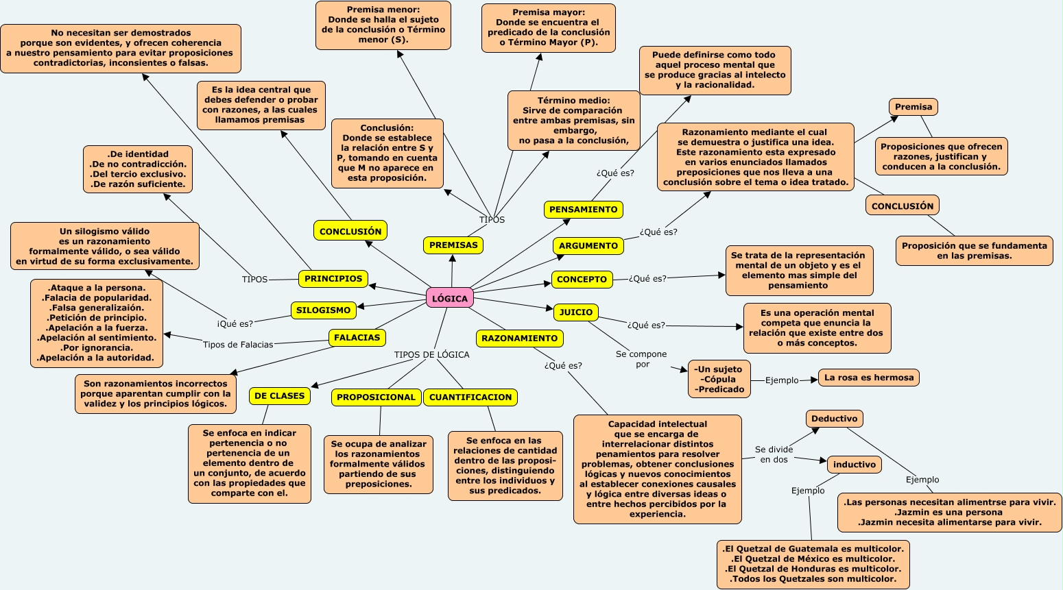 Este Cmap, tiene información relacionada con: CAMINOS, LÓGICA ???? FALACIAS, JUICIO ¿Qué es? Es una operación mental competa que enuncia la relación que existe entre dos o más conceptos., DE CLASES ???? Se enfoca en indicar pertenencia o no pertenencia de un elemento dentro de un conjunto, de acuerdo con las propiedades que comparte con el., Deductivo Ejemplo .Las personas necesitan alimentrse para vivir. .Jazmin es una persona .Jazmin necesita alimentarse para vivir., Capacidad intelectual que se encarga de interrelacionar distintos penamientos para resolver problemas, obtener conclusiones lógicas y nuevos conocimientos al establecer conexiones causales y lógica entre diversas ideas o entre hechos percibidos por la experiencia. Se divide en dos inductivo, LÓGICA TIPOS DE LÓGICA DE CLASES, FALACIAS ???? Son razonamientos incorrectos porque aparentan cumplir con la validez y los principios lógicos., PREMISAS TIPOS Premisa menor: Donde se halla el sujeto de la conclusión o Término menor (S)., PENSAMIENTO ¿Qué es? Puede definirse como todo aquel proceso mental que se produce gracias al intelecto y la racionalidad., inductivo Ejemplo .El Quetzal de Guatemala es multicolor. .El Quetzal de México es multicolor. .El Quetzal de Honduras es multicolor. .Todos los Quetzales son multicolor., Premisa ???? Proposiciones que ofrecen razones, justifican y conducen a la conclusión., LÓGICA ???? ARGUMENTO, CONCLUSIÓN ???? Proposición que se fundamenta en las premisas., Razonamiento mediante el cual se demuestra o justifica una idea. Este razonamiento esta expresado en varios enunciados llamados preposiciones que nos lleva a una conclusión sobre el tema o idea tratado. ???? CONCLUSIÓN, LÓGICA ???? CONCEPTO, LÓGICA ???? SILOGISMO, PREMISAS TIPOS Conclusión: Donde se establece la relación entre S y P, tomando en cuenta que M no aparece en esta proposición., LÓGICA ???? JUICIO, LÓGICA ???? RAZONAMIENTO, LÓGICA ???? PREMISAS