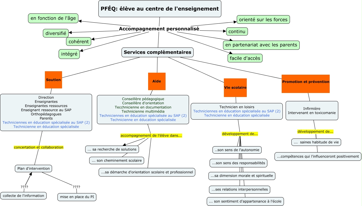 Cette carte de concepts créée avec IHMC CmapTools traite de: Services complémentaires Eulalie-Durocher, PFÉQ: élève au centre de l'enseignement Accompagnement personnalisé intégré, Services complémentaires Vie scolaire Technicien en loisirs Techniciennes en éducation spécialisée au SAP (2) Technicienne en éducation spécialisée, PFÉQ: élève au centre de l'enseignement Accompagnement personnalisé diversifié, Services complémentaires Aide Conseillère pédagogique Conseillère d'orientation Tecchnicienne en documentation Technicienne multimédia Techniciennes en éducation spécialisée au SAP (2) Technicienne en éducation spécialisée, Conseillère pédagogique Conseillère d'orientation Tecchnicienne en documentation Technicienne multimédia Techniciennes en éducation spécialisée au SAP (2) Technicienne en éducation spécialisée accompagnement de l'élève dans... ...sa démarche d'orientation scolaire et professionnel, Infirmière Intervenant en toxicomanie développement de... ...compétences qui l'influenceront positivement, PFÉQ: élève au centre de l'enseignement Accompagnement personnalisé en fonction de l'âge, PFÉQ: élève au centre de l'enseignement Accompagnement personnalisé en partenariat avec les parents, collecte de l'information ???? Plan d'intervention, Direction Enseignantes Enseignantes ressources Enseignant ressource au SAP Orthopédagogues Parents Techniciennes en éducation spécialisée au SAP (2) Technicienne en éducation spécialisée concertation et collaboration Plan d'intervention, Services complémentaires Soutien Direction Enseignantes Enseignantes ressources Enseignant ressource au SAP Orthopédagogues Parents Techniciennes en éducation spécialisée au SAP (2) Technicienne en éducation spécialisée, PFÉQ: élève au centre de l'enseignement Accompagnement personnalisé continu, PFÉQ: élève au centre de l'enseignement Accompagnement personnalisé Services complémentaires, Technicien en loisirs Techniciennes en éducation spécialisée au SAP (2) Technicienne en éducation spécialisée développement de... ...sa dimension morale et spirituelle, Plan d'intervention ???? mise en place du PI, Conseillère pédagogique Conseillère d'orientation Tecchnicienne en documentation Technicienne multimédia Techniciennes en éducation spécialisée au SAP (2) Technicienne en éducation spécialisée accompagnement de l'élève dans... ... sa recherche de solutions, Technicien en loisirs Techniciennes en éducation spécialisée au SAP (2) Technicienne en éducation spécialisée développement de... ...son sens des responsabilités, Technicien en loisirs Techniciennes en éducation spécialisée au SAP (2) Technicienne en éducation spécialisée développement de... ..son sens de l'autonomie, Technicien en loisirs Techniciennes en éducation spécialisée au SAP (2) Technicienne en éducation spécialisée développement de... ...ses relations interpersonnelles, Conseillère pédagogique Conseillère d'orientation Tecchnicienne en documentation Technicienne multimédia Techniciennes en éducation spécialisée au SAP (2) Technicienne en éducation spécialisée accompagnement de l'élève dans... ... son cheminement scolaire