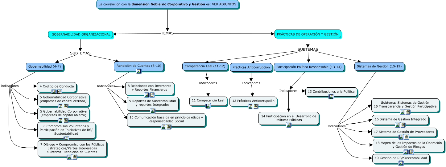 Este Cmap, tiene información relacionada con: ETHOS Gobierno Corporativo y Gestión, Gobernabilidad (4-7) Indicadores 7 Diálogo y Compromiso con los Públicos Estratégicos/Partes Interesadas Subtema: Rendición de Cuentas, GOBERNABILIDAD ORGANIZACIONAL SUBTEMAS Rendición de Cuentas (8-10), Prácticas Anticorrupción Indicadores 12 Prácticas Anticorrupción, Rendición de Cuentas (8-10) Indicadores 9 Reportes de Sustentabilidad y reportes Integrados, Gobernabilidad (4-7) Indicadores 5 Gobernabilidad Corpor ativa (empresas de capital cerrado), Gobernabilidad (4-7) Indicadores 6 Compromisos Voluntarios y Participación en Iniciativas de RS/ Sustentabilidad, Participación Política Responsable (13-14) Indicadores 14 Participación en el Desarrollo de Políticas Públicas, La correlación con la dimensión Gobierno Corporativo y Gestión es: VER ADJUNTOS TEMAS PR�?CTICAS DE OPERACIÓN Y GESTIÓN, Participación Política Responsable (13-14) Indicadores 13 Contribuciones a la Política, GOBERNABILIDAD ORGANIZACIONAL SUBTEMAS Gobernabilidad (4-7), La correlación con la dimensión Gobierno Corporativo y Gestión es: VER ADJUNTOS TEMAS GOBERNABILIDAD ORGANIZACIONAL, Sistemas de Gestión (15-19) Indicadores 16 Sistema de Gestión Integrado, Rendición de Cuentas (8-10) Indicadores 10 Comunicación basa da en principios éticos y Responsabilidad Social, Gobernabilidad (4-7) Indicadores 5 Gobernabilidad Corpor ativa (empresas de capital abierto), Sistemas de Gestión (15-19) Indicadores 18 Mapeo de los Impactos de la Operación y Gestión de Riesgos, PR�?CTICAS DE OPERACIÓN Y GESTIÓN SUBTEMAS Prácticas Anticorrupción, Sistemas de Gestión (15-19) Indicadores 17 Sistema de Gestión de Proveedores, Rendición de Cuentas (8-10) Indicadores 8 Relaciones con Inversores y Reportes Financieros, Sistemas de Gestión (15-19) Indicadores Subtema: Sistemas de Gestión 15 Transparencia y Gestión Participativa, Gobernabilidad (4-7) Indicadores 4 Código de Conducta