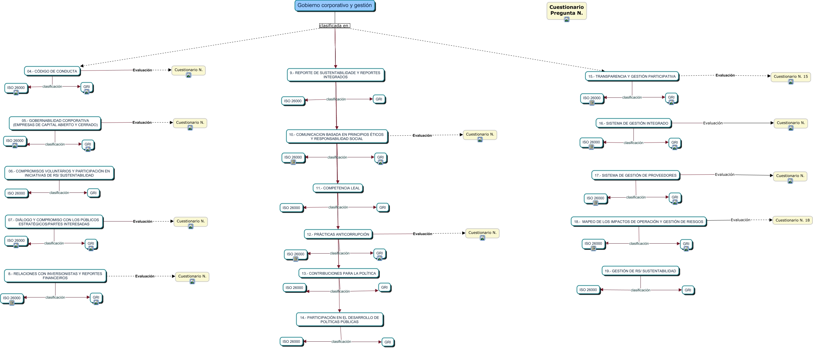 Este Cmap, tiene información relacionada con: DIMENSIÓN GOBIERNO, 18.- MAPEO DE LOS IMPACTOS DE OPERACIÓN Y GESTIÓN DE RIESGOS clasificación ISO 26000, Gobierno corporativo y gestión clasificada en 15.- TRANSPARENCIA Y GESTIÓN PARTICIPATIVA, Gobierno corporativo y gestión clasificada en 11.- COMPETENCIA LEAL, 13.- CONTRIBUCIONES PARA LA POLÍTICA clasificación GRI, 10.- COMUNICACION BASADA EN PRINCIPIOS ÉTICOS Y RESPONSABILIDAD SOCIAL clasificación ISO 26000, 8.- RELACIONES CON INVERSIONISTAS Y REPORTES FINANCEIROS Evaluación Cuestionario N., 16.- SISTEMA DE GESTIÓN INTEGRADO clasificación ISO 26000, 13.- CONTRIBUCIONES PARA LA POLÍTICA clasificación ISO 26000, 19.- GESTIÓN DE RS/ SUSTENTABILIDAD clasificación ISO 26000, 07.- DIÁLOGO Y COMPROMISO CON LOS PÚBLICOS ESTRATÉGICOS/PARTES INTERESADAS Evaluación Cuestionario N., 17.- SISTEMA DE GESTIÓN DE PROVEEDORES clasificación GRI, 05.- GOBERNABILIDAD CORPORATIVA (EMPRESAS DE CAPITAL ABIERTO Y CERRADO) clasificación GRI, Gobierno corporativo y gestión clasificada en 12.- PRÁCTICAS ANTICORRUPCIÓN, 14.- PARTICIPACIÓN EN EL DESARROLLO DE POLÍTICAS PÚBLICAS clasificación ISO 26000, 18.- MAPEO DE LOS IMPACTOS DE OPERACIÓN Y GESTIÓN DE RIESGOS clasificación GRI, 18.- MAPEO DE LOS IMPACTOS DE OPERACIÓN Y GESTIÓN DE RIESGOS Evaluación Cuestionario N. 18, 06.- COMPROMISOS VOLUNTÁRIOS Y PARTICIPACIÓN EN INICIATIVAS DE RS/ SUSTENTABILIDAD clasificación ISO 26000, 05.- GOBERNABILIDAD CORPORATIVA (EMPRESAS DE CAPITAL ABIERTO Y CERRADO) Evaluación Cuestionario N., 19.- GESTIÓN DE RS/ SUSTENTABILIDAD clasificación GRI, Gobierno corporativo y gestión clasificada en 8.- RELACIONES CON INVERSIONISTAS Y REPORTES FINANCEIROS