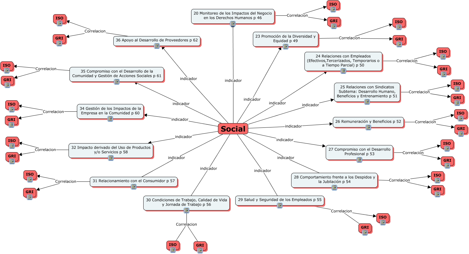Este Cmap, tiene información relacionada con: ALTIORA SOCIAL, 30 Condiciones de Trabajo, Calidad de Vida y Jornada de Trabajo p 56 Correlacion GRI, 28 Comportamiento frente a los Despidos y la Jubilación p 54 Correlacion GRI, 35 Compromiso con el Desarrollo de la Comunidad y Gestión de Acciones Sociales p 61 Correlacion ISO, Social indicador 27 Compromiso con el Desarrollo Profesional p 53, Social indicador 24 Relaciones con Empleados (Efectivos,Tercerizados, Temporarios o a Tiempo Parcial) p 50, 25 Relaciones con Sindicatos Subtema: Desarrollo Humano, Beneficios y Entrenamiento p 51 Correlacion ISO, 24 Relaciones con Empleados (Efectivos,Tercerizados, Temporarios o a Tiempo Parcial) p 50 Correlacion ISO, 36 Apoyo al Desarrollo de Proveedores p 62 Correlacion ISO, 32 Impacto derivado del Uso de Productos y/o Servicios p 58 Correlacion ISO, Social indicador 32 Impacto derivado del Uso de Productos y/o Servicios p 58, 24 Relaciones con Empleados (Efectivos,Tercerizados, Temporarios o a Tiempo Parcial) p 50 Correlacion GRI, 31 Relacionamiento con el Consumidor p 57 Correlacion ISO, 28 Comportamiento frente a los Despidos y la Jubilación p 54 Correlacion ISO, Social indicador 28 Comportamiento frente a los Despidos y la Jubilación p 54, 23 Promoción de la Diversidad y Equidad p 49 Correlacion ISO, 34 Gestión de los Impactos de la Empresa en la Comunidad p 60 Correlacion GRI, 32 Impacto derivado del Uso de Productos y/o Servicios p 58 Correlacion GRI, Social indicador 34 Gestión de los Impactos de la Empresa en la Comunidad p 60, 20 Monitoreo de los Impactos del Negocio en los Derechos Humanos p 46 Correlacion GRI, 29 Salud y Seguridad de los Empleados p 55 Correlacion ISO