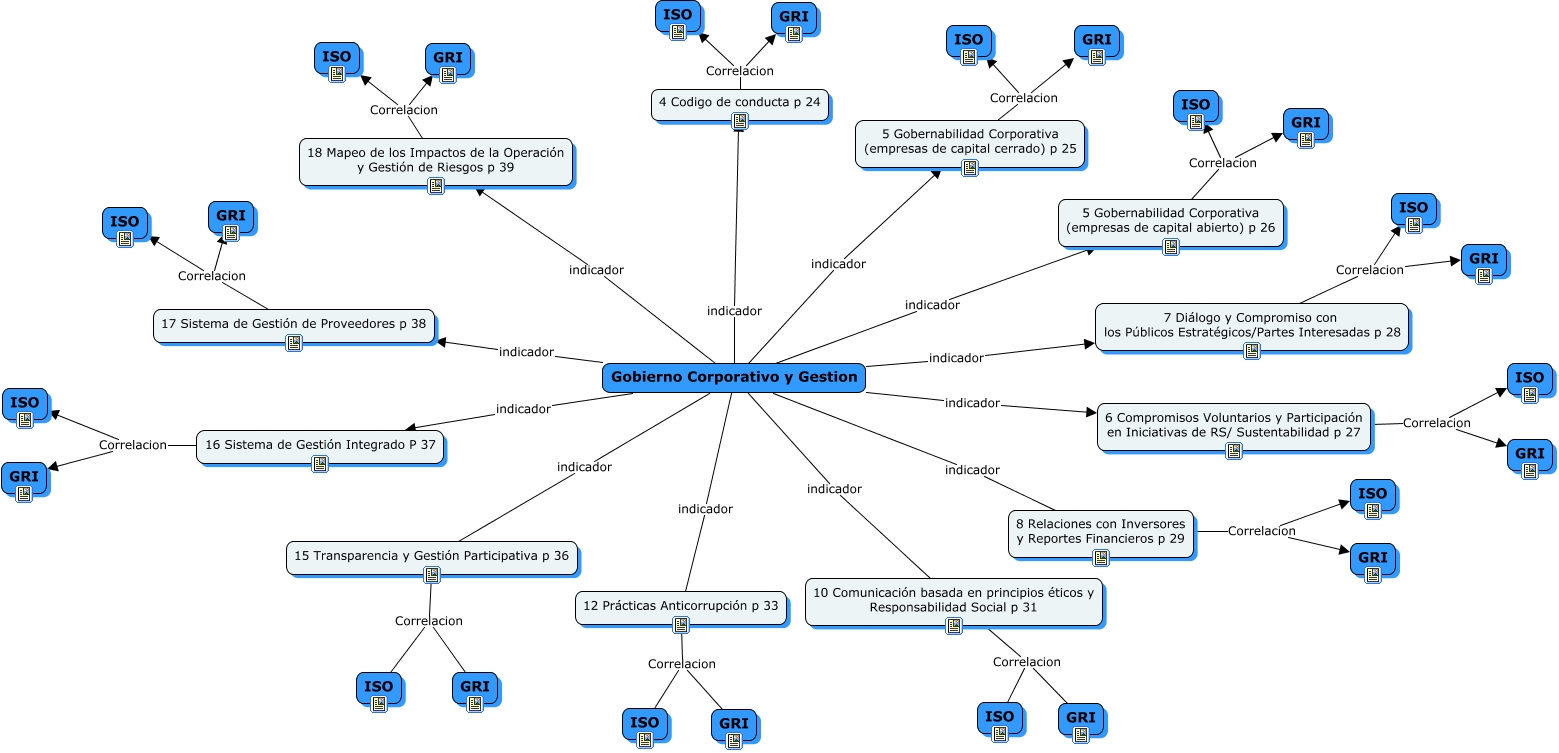 Este Cmap, tiene información relacionada con: ALTIORA GOBIERNO CORPORATIVO Y GESTION, Gobierno Corporativo y Gestion indicador 16 Sistema de Gestión Integrado P 37, 5 Gobernabilidad Corporativa (empresas de capital cerrado) p 25 Correlacion GRI, 16 Sistema de Gestión Integrado P 37 Correlacion ISO, 5 Gobernabilidad Corporativa (empresas de capital abierto) p 26 Correlacion ISO, 5 Gobernabilidad Corporativa (empresas de capital abierto) p 26 Correlacion GRI, Gobierno Corporativo y Gestion indicador 17 Sistema de Gestión de Proveedores p 38, Gobierno Corporativo y Gestion indicador 10 Comunicación basada en principios éticos y Responsabilidad Social p 31, 16 Sistema de Gestión Integrado P 37 Correlacion GRI, 17 Sistema de Gestión de Proveedores p 38 Correlacion GRI, 7 Diálogo y Compromiso con los Públicos Estratégicos/Partes Interesadas p 28 Correlacion GRI, 8 Relaciones con Inversores y Reportes Financieros p 29 Correlacion ISO, 6 Compromisos Voluntarios y Participación en Iniciativas de RS/ Sustentabilidad p 27 Correlacion ISO, 15 Transparencia y Gestión Participativa p 36 Correlacion ISO, Gobierno Corporativo y Gestion indicador 5 Gobernabilidad Corporativa (empresas de capital cerrado) p 25, Gobierno Corporativo y Gestion indicador 6 Compromisos Voluntarios y Participación en Iniciativas de RS/ Sustentabilidad p 27, 7 Diálogo y Compromiso con los Públicos Estratégicos/Partes Interesadas p 28 Correlacion ISO, Gobierno Corporativo y Gestion indicador 5 Gobernabilidad Corporativa (empresas de capital abierto) p 26, 15 Transparencia y Gestión Participativa p 36 Correlacion GRI, 12 Prácticas Anticorrupción p 33 Correlacion ISO, Gobierno Corporativo y Gestion indicador 7 Diálogo y Compromiso con los Públicos Estratégicos/Partes Interesadas p 28
