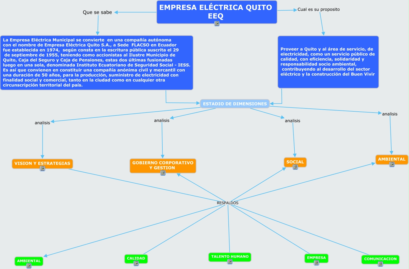 Este Cmap, tiene información relacionada con: ESTADIOS PARA EEQ, VISION Y ESTRATEGIAS RESPALDOS AMBIENTAL, La Empresa Eléctrica Municipal se convierte en una compañía autónoma con el nombre de Empresa Eléctrica Quito S.A., a Sede FLACSO en Ecuador fue establecida en 1974, según consta en la escritura pública suscrita el 29 de septiembre de 1955, teniendo como accionistas al Ilustre Municipio de Quito, Caja del Seguro y Caja de Pensiones, estas dos últimas fusionadas luego en una sola, denominada Instituto Ecuatoriano de Seguridad Social - IESS. Es así que convienen en constituir una compañía anónima civil y mercantil con una duración de 50 años, para la producción, suministro de electricidad con finalidad social y comercial, tanto en la ciudad como en cualquier otra circunscripción territorial del país. ???? ESTADIO DE DIMENSIONES, VISION Y ESTRATEGIAS RESPALDOS EMPRESA, VISION Y ESTRATEGIAS RESPALDOS AMBIENTAL, VISION Y ESTRATEGIAS RESPALDOS CALIDAD, ESTADIO DE DIMENSIONES analisis VISION Y ESTRATEGIAS, ESTADIO DE DIMENSIONES analisis GOBIERNO CORPORATIVO Y GESTION, EMPRESA ELÉCTRICA QUITO EEQ Que se sabe La Empresa Eléctrica Municipal se convierte en una compañía autónoma con el nombre de Empresa Eléctrica Quito S.A., a Sede FLACSO en Ecuador fue establecida en 1974, según consta en la escritura pública suscrita el 29 de septiembre de 1955, teniendo como accionistas al Ilustre Municipio de Quito, Caja del Seguro y Caja de Pensiones, estas dos últimas fusionadas luego en una sola, denominada Instituto Ecuatoriano de Seguridad Social - IESS. Es así que convienen en constituir una compañía anónima civil y mercantil con una duración de 50 años, para la producción, suministro de electricidad con finalidad social y comercial, tanto en la ciudad como en cualquier otra circunscripción territorial del país., Proveer a Quito y al área de servicio, de electricidad, como un servicio público de calidad, con eficiencia, solidaridad y responsabilidad socio ambiental, contribuyendo al desarrollo del sector eléctrico y la construcción del Buen Vivir ???? ESTADIO DE DIMENSIONES, ESTADIO DE DIMENSIONES analisis AMBIENTAL, VISION Y ESTRATEGIAS RESPALDOS TALENTO HUMANO, VISION Y ESTRATEGIAS RESPALDOS COMUNICACION, ESTADIO DE DIMENSIONES analisis SOCIAL, VISION Y ESTRATEGIAS RESPALDOS SOCIAL, EMPRESA ELÉCTRICA QUITO EEQ Cual es su proposito Proveer a Quito y al área de servicio, de electricidad, como un servicio público de calidad, con eficiencia, solidaridad y responsabilidad socio ambiental, contribuyendo al desarrollo del sector eléctrico y la construcción del Buen Vivir, VISION Y ESTRATEGIAS RESPALDOS GOBIERNO CORPORATIVO Y GESTION