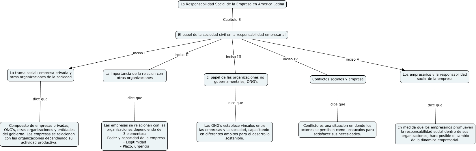 Este Cmap, tiene información relacionada con: CAPITULO 5, Los empresarios y la responsabilidad social de la empresa dice que En medida que los empresarios promueven la responsabilidad social dentro de sus organizaciones, hara posible el cambio de la dinamica empresarial., La importancia de la relacion con otras organizaciones dice que Las empresas se relacionan con las organizaciones dependiendo de 3 elementos: - Poder y capacidad de la empresa - Legitimidad - Plazo, urgencia, El papel de la sociedad civil en la responsabilidad empresarial inciso III El papel de las organizaciones no gubernamentales, ONG's, El papel de la sociedad civil en la responsabilidad empresarial inciso I La trama social: empresa privada y otras organizaciones de la sociedad, La trama social: empresa privada y otras organizaciones de la sociedad dice que Compuesto de empresas privadas, ONG's, otras organizaciones y entidades del gobierno. Las empresas se relacionan con las organizaciones dependiendo su actividad productiva., El papel de las organizaciones no gubernamentales, ONG's dice que Las ONG's establece vinculos entre las empresas y la sociedad, capacitando en diferentes ambitos para el desarrollo sostenible., La Responsabilidad Social de la Empresa en America Latina Capitulo 5 El papel de la sociedad civil en la responsabilidad empresarial, El papel de la sociedad civil en la responsabilidad empresarial inciso V Los empresarios y la responsabilidad social de la empresa, El papel de la sociedad civil en la responsabilidad empresarial inciso IV Conflictos sociales y empresa, El papel de la sociedad civil en la responsabilidad empresarial inciso II La importancia de la relacion con otras organizaciones, Conflictos sociales y empresa dice que Conflicto es una situacion en donde los actores se perciben como obstaculos para satisfacer sus necesidades.