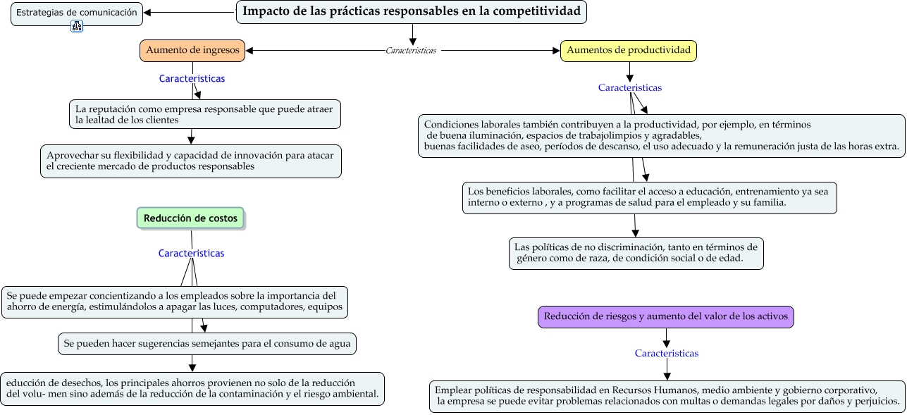 Este Cmap, tiene información relacionada con: Impacto de las practicas responsables - Cap 17, Impacto de las prácticas responsables en la competitividad Caracteristicas Reducción de riesgos y aumento del valor de los activos, Reducción de riesgos y aumento del valor de los activos Caracteristicas Emplear políticas de responsabilidad en Recursos Humanos, medio ambiente y gobierno corporativo, la empresa se puede evitar problemas relacionados con multas o demandas legales por daños y perjuicios., Aumento de ingresos Caracteristicas La reputación como empresa responsable que puede atraer la lealtad de los clientes, Aumentos de productividad Caracteristicas Condiciones laborales también contribuyen a la productividad, por ejemplo, en términos de buena iluminación, espacios de trabajolimpios y agradables, buenas facilidades de aseo, períodos de descanso, el uso adecuado y la remuneración justa de las horas extra., Reducción de costos Caracteristicas educción de desechos, los principales ahorros provienen no solo de la reducción del volu- men sino además de la reducción de la contaminación y el riesgo ambiental., Impacto de las prácticas responsables en la competitividad Caracteristicas Aumento de ingresos, Aumentos de productividad Caracteristicas Los beneficios laborales, como facilitar el acceso a educación, entrenamiento ya sea interno o externo , y a programas de salud para el empleado y su familia., Impacto de las prácticas responsables en la competitividad Caracteristicas Reducción de costos, Aumentos de productividad Caracteristicas Las políticas de no discriminación, tanto en términos de género como de raza, de condición social o de edad., Impacto de las prácticas responsables en la competitividad ???? Estrategias de comunicación, Reducción de costos Caracteristicas Se puede empezar concientizando a los empleados sobre la importancia del ahorro de energía, estimulándolos a apagar las luces, computadores, equipos, Reducción de costos Caracteristicas Se pueden hacer sugerencias semejantes para el consumo de agua, Aumento de ingresos Caracteristicas Aprovechar su flexibilidad y capacidad de innovación para atacar el creciente mercado de productos responsables, Impacto de las prácticas responsables en la competitividad Caracteristicas Aumentos de productividad