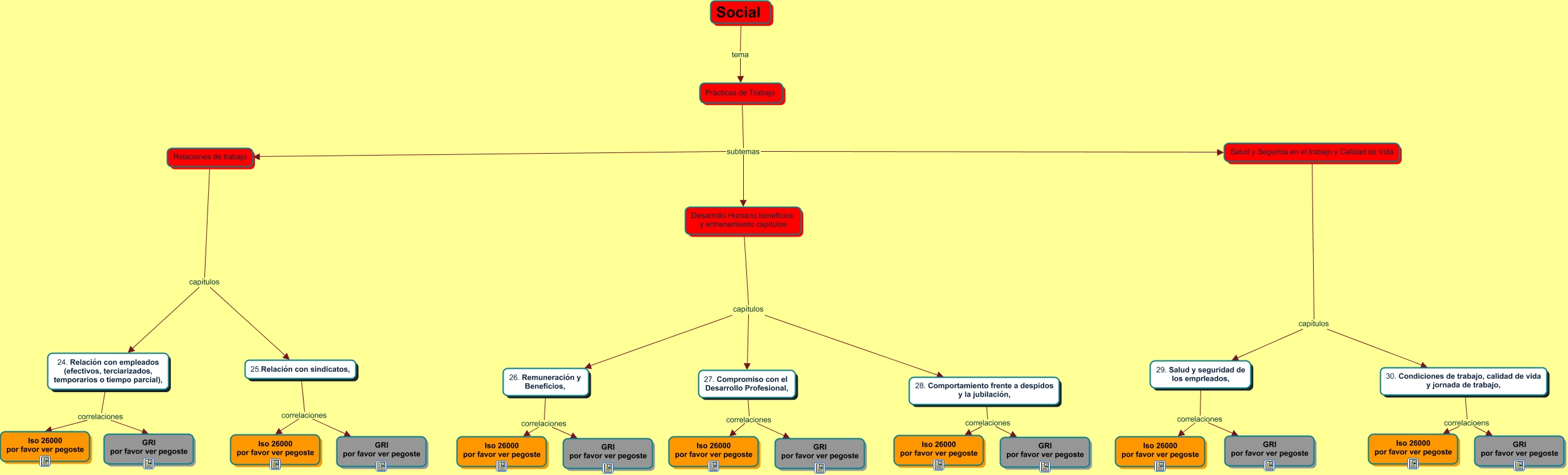 This Concept Map, created with IHMC CmapTools, has information related to: Derechos Humanos Parte 2, 25.Relación con sindicatos, correlaciones GRI por favor ver pegoste, Salud y Segurida en el trabajo y Calidad de Vida capítulos 29. Salud y seguridad de los emprleados,, Desarrollo Humano beneficios y entrenamiento capítulos capítulos 27. Compromiso con el Desarrollo Profesional,, Prácticas de Trabajo subtemas Salud y Segurida en el trabajo y Calidad de Vida, 29. Salud y seguridad de los emprleados, correlaciones GRI por favor ver pegoste, 24. Relación con empleados (efectivos, terciarizados, temporarios o tiempo parcial), correlaciones Iso 26000 por favor ver pegoste, 26. Remuneración y Beneficios, correlaciones Iso 26000 por favor ver pegoste, 24. Relación con empleados (efectivos, terciarizados, temporarios o tiempo parcial), correlaciones GRI por favor ver pegoste, 27. Compromiso con el Desarrollo Profesional, correlaciones GRI por favor ver pegoste, Prácticas de Trabajo subtemas Desarrollo Humano beneficios y entrenamiento capítulos, 30. Condiciones de trabajo, calidad de vida y jornada de trabajo, correlacioens GRI por favor ver pegoste, Desarrollo Humano beneficios y entrenamiento capítulos capítulos 26. Remuneración y Beneficios,, Relaciones de trabajo capítulos 24. Relación con empleados (efectivos, terciarizados, temporarios o tiempo parcial),, Relaciones de trabajo capítulos 25.Relación con sindicatos,, 25.Relación con sindicatos, correlaciones Iso 26000 por favor ver pegoste, 26. Remuneración y Beneficios, correlaciones GRI por favor ver pegoste, 29. Salud y seguridad de los emprleados, correlaciones Iso 26000 por favor ver pegoste, Social tema Prácticas de Trabajo, Salud y Segurida en el trabajo y Calidad de Vida capítulos 30. Condiciones de trabajo, calidad de vida y jornada de trabajo,, Desarrollo Humano beneficios y entrenamiento capítulos capítulos 28. Comportamiento frente a despidos y la jubilación,