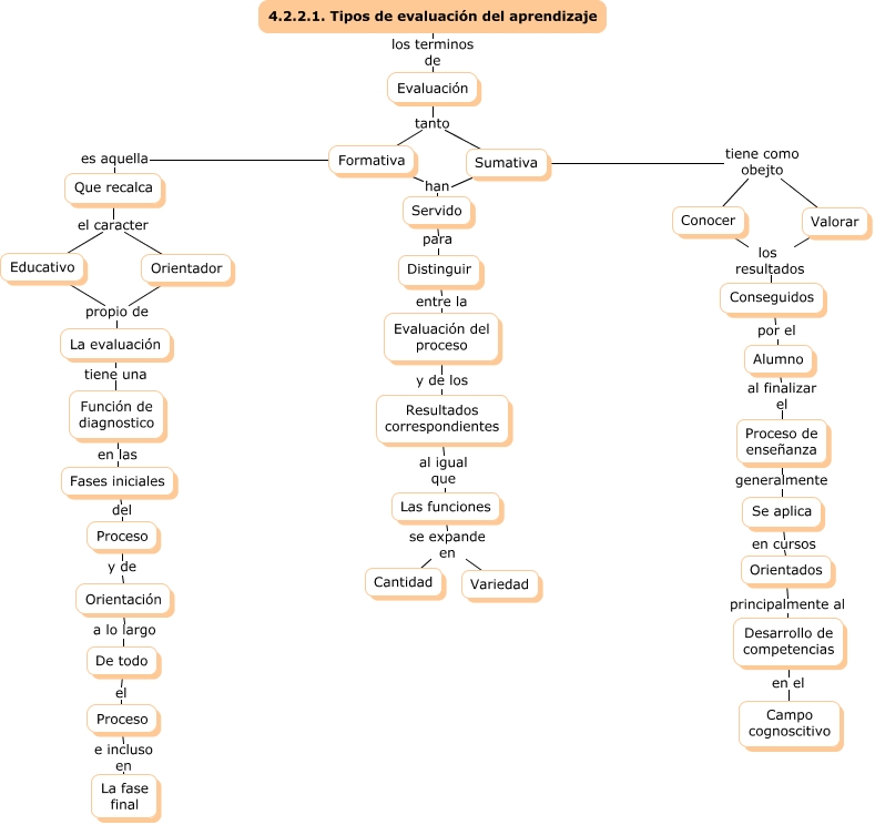Este Cmap, tiene información relacionada con: 4.2.2.1. Tipos, Que recalca el caracter Educativo, Evaluación tanto Formativa, Que recalca el caracter Orientador, Proceso y de Orientación, Educativo propio de La evaluación, Orientados principalmente al Desarrollo de competencias, Proceso de enseñanza generalmente Se aplica, 4.2.2.1. Tipos de evaluación del aprendizaje los terminos de Evaluación, Fases iniciales del Proceso, Función de diagnostico en las Fases iniciales, Conocer los resultados Conseguidos, Sumativa tiene como obejto Conocer, Se aplica en cursos Orientados, Proceso e incluso en La fase final, Las funciones se expande en Cantidad, Formativa es aquella Que recalca, Desarrollo de competencias en el Campo cognoscitivo, Alumno al finalizar el Proceso de enseñanza, Orientador propio de La evaluación, Distinguir entre la Evaluación del proceso