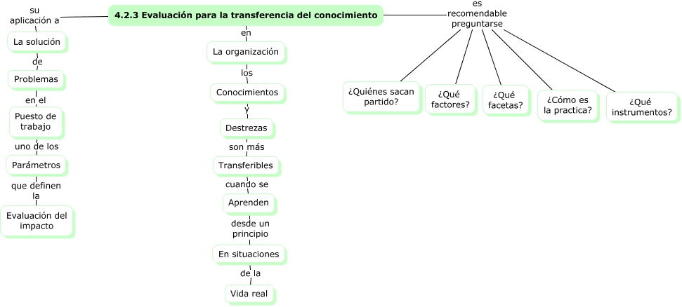 Este Cmap, tiene información relacionada con: 4.2.3 Evaluación, 4.2.3 Evaluación para la transferencia del conocimiento es recomendable preguntarse ¿Qué factores?, Conocimientos y Destrezas, Parámetros que definen la Evaluación del impacto, En situaciones de la Vida real, 4.2.3 Evaluación para la transferencia del conocimiento en La organización, 4.2.3 Evaluación para la transferencia del conocimiento su aplicación a La solución, 4.2.3 Evaluación para la transferencia del conocimiento es recomendable preguntarse ¿Cómo es la practica?, Problemas en el Puesto de trabajo, 4.2.3 Evaluación para la transferencia del conocimiento es recomendable preguntarse ¿Qué facetas?, Transferibles cuando se Aprenden, 4.2.3 Evaluación para la transferencia del conocimiento es recomendable preguntarse ¿Qué instrumentos?, Destrezas son más Transferibles, La organización los Conocimientos, 4.2.3 Evaluación para la transferencia del conocimiento es recomendable preguntarse ¿Quiénes sacan partido?, La solución de Problemas, Puesto de trabajo uno de los Parámetros, Aprenden desde un principio En situaciones