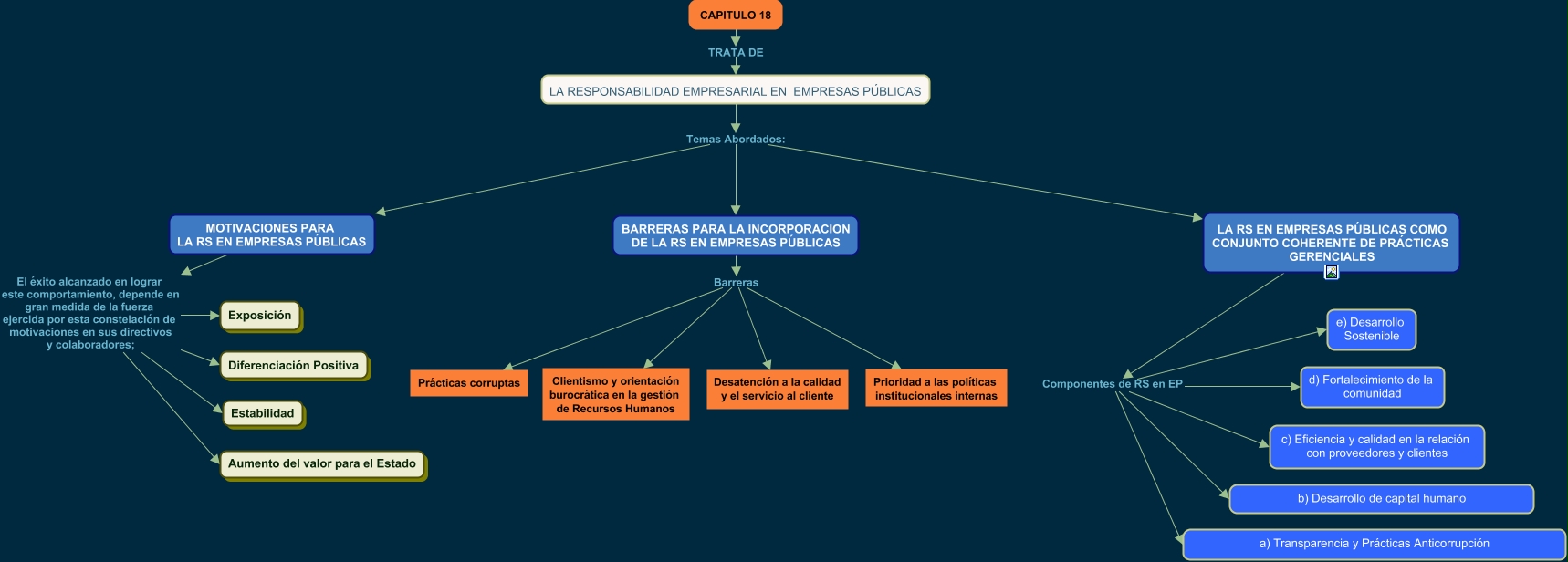Este Cmap, tiene información relacionada con: RS EN EMPRESAS PÚBLICAS, MOTIVACIONES PARA LA RS EN EMPRESAS PÚBLICAS El éxito alcanzado en lograr este comportamiento, depende en gran medida de la fuerza ejercida por esta constelación de motivaciones en sus directivos y colaboradores; Estabilidad, LA RS EN EMPRESAS PÚBLICAS COMO CONJUNTO COHERENTE DE PR�?CTICAS GERENCIALES Componentes de RS en EP e) Desarrollo Sostenible, CAPITULO 18 TRATA DE LA RESPONSABILIDAD EMPRESARIAL EN EMPRESAS PÚBLICAS, LA RS EN EMPRESAS PÚBLICAS COMO CONJUNTO COHERENTE DE PR�?CTICAS GERENCIALES Componentes de RS en EP a) Transparencia y Prácticas Anticorrupción, MOTIVACIONES PARA LA RS EN EMPRESAS PÚBLICAS El éxito alcanzado en lograr este comportamiento, depende en gran medida de la fuerza ejercida por esta constelación de motivaciones en sus directivos y colaboradores; Diferenciación Positiva, MOTIVACIONES PARA LA RS EN EMPRESAS PÚBLICAS El éxito alcanzado en lograr este comportamiento, depende en gran medida de la fuerza ejercida por esta constelación de motivaciones en sus directivos y colaboradores; Aumento del valor para el Estado, MOTIVACIONES PARA LA RS EN EMPRESAS PÚBLICAS El éxito alcanzado en lograr este comportamiento, depende en gran medida de la fuerza ejercida por esta constelación de motivaciones en sus directivos y colaboradores; Exposición, LA RESPONSABILIDAD EMPRESARIAL EN EMPRESAS PÚBLICAS Temas Abordados: MOTIVACIONES PARA LA RS EN EMPRESAS PÚBLICAS, LA RS EN EMPRESAS PÚBLICAS COMO CONJUNTO COHERENTE DE PR�?CTICAS GERENCIALES Componentes de RS en EP c) Eficiencia y calidad en la relación con proveedores y clientes, BARRERAS PARA LA INCORPORACION DE LA RS EN EMPRESAS PÚBLICAS Barreras Desatención a la calidad y el servicio al cliente, LA RESPONSABILIDAD EMPRESARIAL EN EMPRESAS PÚBLICAS Temas Abordados: BARRERAS PARA LA INCORPORACION DE LA RS EN EMPRESAS PÚBLICAS, BARRERAS PARA LA INCORPORACION DE LA RS EN EMPRESAS PÚBLICAS Barreras Clientismo y orientación burocrática en la gestión de Recursos Humanos, LA RS EN EMPRESAS PÚBLICAS COMO CONJUNTO COHERENTE DE PR�?CTICAS GERENCIALES Componentes de RS en EP d) Fortalecimiento de la comunidad, BARRERAS PARA LA INCORPORACION DE LA RS EN EMPRESAS PÚBLICAS Barreras Prácticas corruptas, BARRERAS PARA LA INCORPORACION DE LA RS EN EMPRESAS PÚBLICAS Barreras Prioridad a las políticas institucionales internas, LA RESPONSABILIDAD EMPRESARIAL EN EMPRESAS PÚBLICAS Temas Abordados: LA RS EN EMPRESAS PÚBLICAS COMO CONJUNTO COHERENTE DE PR�?CTICAS GERENCIALES, LA RS EN EMPRESAS PÚBLICAS COMO CONJUNTO COHERENTE DE PR�?CTICAS GERENCIALES Componentes de RS en EP b) Desarrollo de capital humano