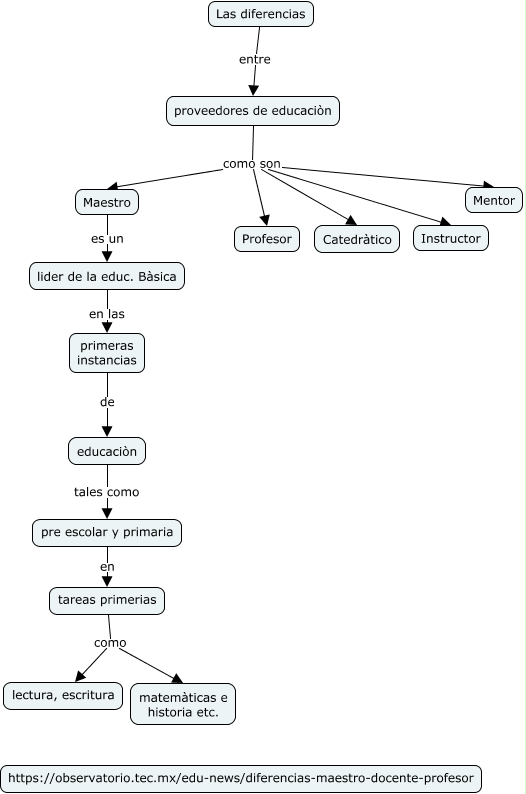 Este Cmap, tiene información relacionada con: Diferencias docentes, educaciòn tales como pre escolar y primaria, proveedores de educaciòn como son Profesor, proveedores de educaciòn como son Mentor, primeras instancias de educaciòn, pre escolar y primaria en tareas primerias, tareas primerias como lectura, escritura, Maestro es un lider de la educ. Bàsica, proveedores de educaciòn como son Catedràtico, proveedores de educaciòn como son Instructor, tareas primerias como matemàticas e historia etc., lider de la educ. Bàsica en las primeras instancias, proveedores de educaciòn como son Maestro, Las diferencias entre proveedores de educaciòn