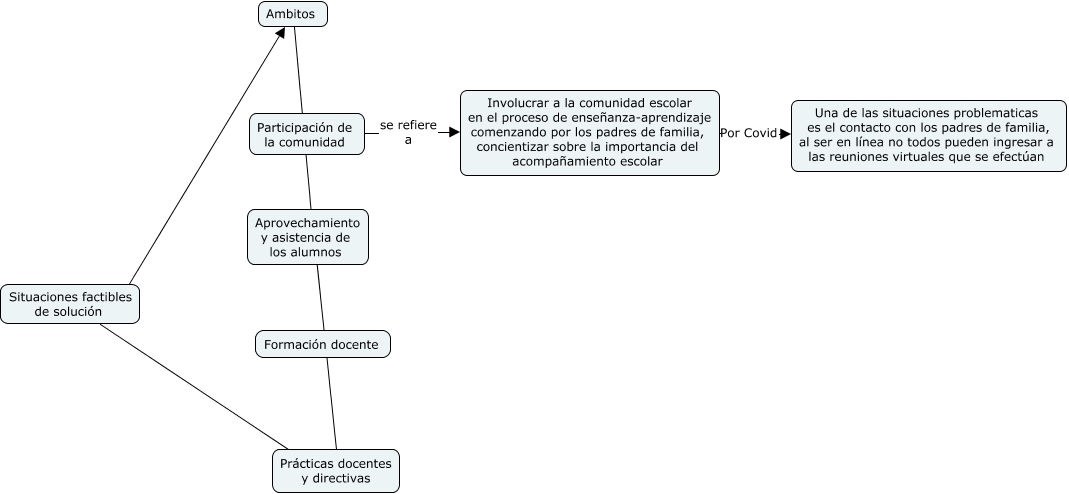 Este Cmap, tiene información relacionada con: GESTIÓN PEMC, Situaciones factibles de solución ???? Prácticas docentes y directivas, Situaciones factibles de solución ???? Ambitos, Involucrar a la comunidad escolar en el proceso de enseñanza-aprendizaje comenzando por los padres de familia, concientizar sobre la importancia del acompañamiento escolar Por Covid Una de las situaciones problematicas es el contacto con los padres de familia, al ser en línea no todos pueden ingresar a las reuniones virtuales que se efectúan, Participación de la comunidad se refiere a Involucrar a la comunidad escolar en el proceso de enseñanza-aprendizaje comenzando por los padres de familia, concientizar sobre la importancia del acompañamiento escolar, Ambitos ???? Prácticas docentes y directivas