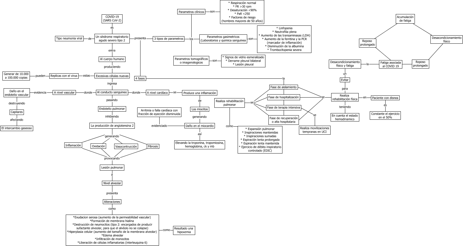 Este Cmap, tiene información relacionada con: PATOKINE COVID 19, Al conducto sanguineo pasando Endotelio pulmonar, Replicas con el virus pueden Generar de 10.000 a 100.000 copias, Fase de recuperación o alta hospitalaria se Realiza rehabilitación pulmonar, Evitar un Desacondicionamiento físico y fatiga, La producción de angiotensina 2 generando Fibrosis, *Exudacion serosa (aumento de la permeabilidad vascular) *Formación de membrana hialina *Destrucción de neumocitos (tipo 2: encargados de producir sufactante alveolar, para que el alvéolo no se colapse) *Hiperplasia celular (aumento del tamaño de la membrana alveolar) *Edema alveolar *Infiltración de monocitos *Liberación de células inflamatorias (interleuquina 6) como Resultado una hipoxemia, Un síndrome respiratorio agudo severo tipo 2 entra Al cuerpo humano, Reposo prolongado ???? Desacondicionamiento físico, Daño en el endotelio vascular destruyendo Capilares, Un síndrome respiratorio agudo severo tipo 2 presenta 4 fases, Fase de recuperación o alta hospitalaria se Realiza rehabilitación física, Realiza rehabilitación pulmonar como * Expansión pulmonar * Inspiraciones mantenidas * Inspiraciones sumadas * Espiración lenta prolongada * Espiración lenta mantenida * Ejercicio de débito inspiratorio controlado (EDIC), 4 fases la Fase de hospitalización, Al conducto sanguineo donde A nivel cardíaco, Vasocontrucción provocando Lesión pulmonar, A nivel vascular evidencia Daño en el endotelio vascular, 4 fases la Fase de terapia intensiva, Desacondicionamiento físico ???? Acumulación de fatiga, Un síndrome respiratorio agudo severo tipo 2 presenta 3 tipos de parametros, Desacondicionamiento físico y fatiga la Fatiga asociada al COVID 19