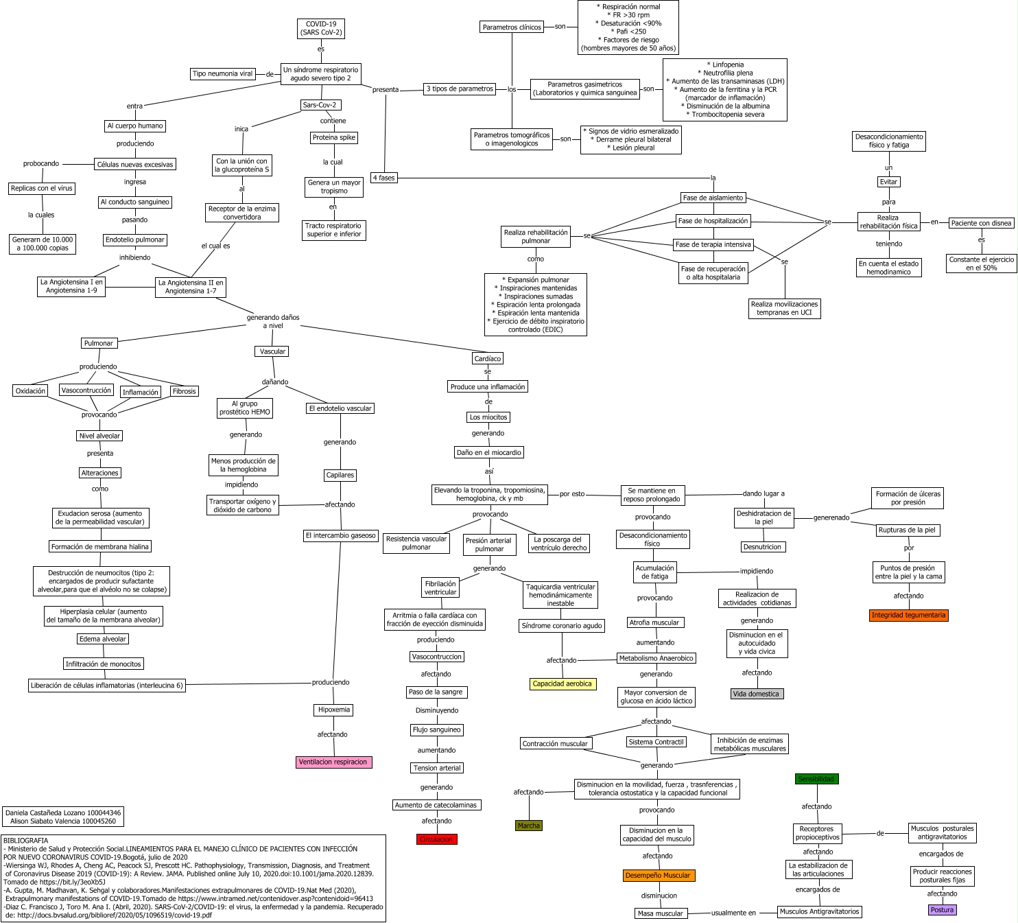 Este Cmap, tiene información relacionada con: Sin Título, Daño en el miocardio así Elevando la troponina, tropomiosina, hemoglobina, ck y mb, Fase de hospitalización se Realiza rehabilitación física, Vascular dañando Al grupo prostético HEMO, 3 tipos de parametros los Parametros gasimetricos (Laboratorios y quimica sanguinea, Pulmonar produciendo Vasocontrucción, Genera un mayor tropismo en Tracto respiratorio superior e inferior, Un síndrome respiratorio agudo severo tipo 2 presenta 3 tipos de parametros, Parametros tomográficos o imagenologicos son * Signos de vidrio esmeralizado * Derrame pleural bilateral * Lesión pleural, Deshidratacion de la piel generenado Rupturas de la piel, Un síndrome respiratorio agudo severo tipo 2 ???? Sars-Cov-2, Destrucción de neumocitos (tipo 2: encargados de producir sufactante alveolar,para que el alvéolo no se colapse) ???? Hiperplasia celular (aumento del tamaño de la membrana alveolar), 4 fases la Fase de terapia intensiva, Masa muscular usualmente en Musculos Antigravitatorios, 4 fases la Fase de recuperación o alta hospitalaria, Deshidratacion de la piel ???? Desnutricion, La Angiotensina II en Angiotensina 1-7 generando daños a nivel Pulmonar, Los miocitos generando Daño en el miocardio, Presión arterial pulmonar generando Taquicardia ventricular hemodinámicamente inestable, Paciente con disnea es Constante el ejercicio en el 50%, Fase de terapia intensiva se Realiza rehabilitación pulmonar