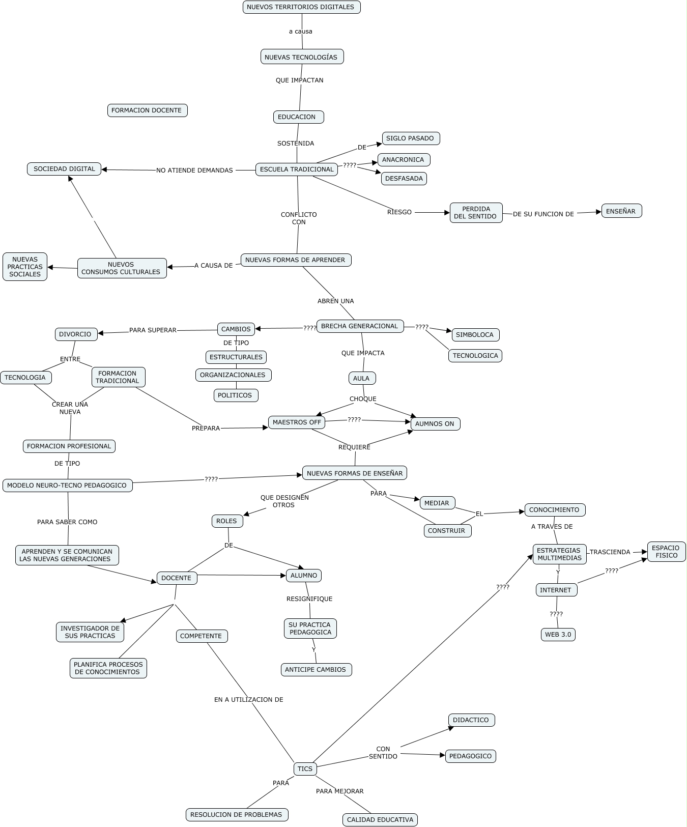 Este Cmap, tiene información relacionada con: NUEVOS TERITORIOS, NUEVAS FORMAS DE ENSEÑAR PARA CONSTRUIR, NUEVOS CONSUMOS CULTURALES ???? NUEVAS PRACTICAS SOCIALES, NUEVAS TECNOLOGÍAS QUE IMPACTAN EDUCACION, NUEVAS FORMAS DE APRENDER ABREN UNA BRECHA GENERACIONAL, BRECHA GENERACIONAL QUE IMPACTA AULA, MAESTROS OFF REQUIERE NUEVAS FORMAS DE ENSEÑAR, ESTRATEGIAS MULTIMEDIAS TRASCIENDA ESPACIO FISICO, PERDIDA DEL SENTIDO DE SU FUNCION DE ENSEÑAR, FORMACION TRADICIONAL CREAR UNA NUEVA FORMACION PROFESIONAL, DOCENTE ???? ALUMNO, APRENDEN Y SE COMUNICAN LAS NUEVAS GENERACIONES ???? DOCENTE, MODELO NEURO-TECNO PEDAGOGICO ???? NUEVAS FORMAS DE ENSEÑAR, FORMACION PROFESIONAL DE TIPO MODELO NEURO-TECNO PEDAGOGICO, AULA CHOQUE MAESTROS OFF, NUEVAS FORMAS DE ENSEÑAR QUE DESIGNEN OTROS ROLES, INTERNET ???? ESPACIO FISICO, CAMBIOS DE TIPO POLITICOS, BRECHA GENERACIONAL ???? TECNOLOGICA, COMPETENTE EN A UTILIZACION DE TICS, TICS PARA MEJORAR CALIDAD EDUCATIVA