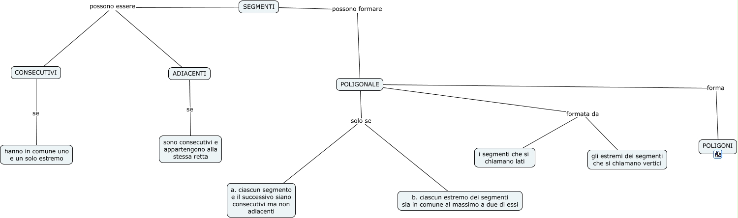 Questa Cmap, creata con IHMC CmapTools, contiene informazioni relative a: segmenti, SEGMENTI possono essere ADIACENTI, CONSECUTIVI se hanno in comune uno e un solo estremo, ADIACENTI se sono consecutivi e appartengono alla stessa retta, SEGMENTI possono formare POLIGONALE, POLIGONALE solo se a. ciascun segmento e il successivo siano consecutivi ma non adiacenti, POLIGONALE formata da gli estremi dei segmenti che si chiamano vertici, SEGMENTI possono essere CONSECUTIVI, POLIGONALE solo se b. ciascun estremo dei segmenti sia in comune al massimo a due di essi, POLIGONALE forma POLIGONI, POLIGONALE formata da i segmenti che si chiamano lati