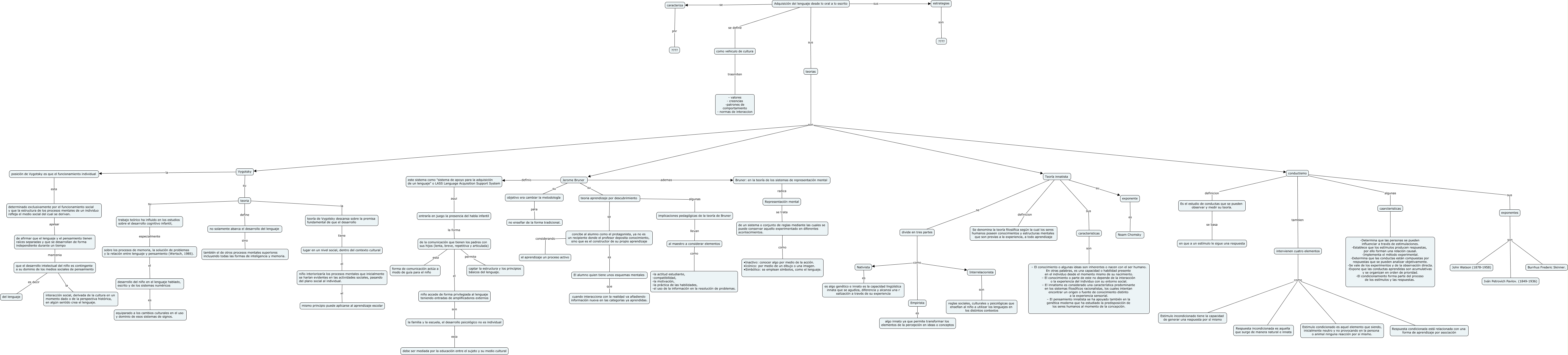 Este Cmap, tiene información relacionada con: Adquisición del lenguaje oral a lo escrito, Representación mental se trata de un sistema o conjunto de reglas mediante las cuales se puede conservar aquello experimentado en diferentes acontecimientos., de la comunicación que tienen los padres con sus hijos (lenta, breve, repetitiva y articulada) permite captar la estructura y los principios básicos del lenguaje., la familia y la escuela, el desarrollo psicológico no es individual esta debe ser mediada por la educación entre el sujeto y su medio cultural, lugar en un nivel social, dentro del contexto cultural el niño interiorizaría los procesos mentales que inicialmente se harían evidentes en las actividades sociales, pasando del plano social al individual., al maestro a considerar elementos como -la actitud estudiante, -compatibilidad, -la motivación, -la práctica de las habilidades, -el uso de la información en la resolución de problemas., caarcteristicas son - Determina que las personas se pueden influenciar a través de estimulaciones. - Establece que los estímulos producen respuestas, por ello forman una relación causal. - Implementa el método experimental. - Determina que las conductas están compuestas por respuestas que se pueden analizar objetivamente. - Se vale de los experimentos y de la observación directa. - Expone que las conductas aprendidas son acumulativas y se organizan en orden de prioridad. - El condicionamiento forma parte del proceso de los estímulos y las respuestas., divide en tres partes como Nativista, Bruner: en la teoría de los sistemas de representación mental radica Representación mental, de la comunicación que tienen los padres con sus hijos (lenta, breve, repetitiva y articulada) el niño accede de forma privilegiada al lenguaje teniendo entradas de amplificadores externos, que el desarrollo intelectual del niño es contingente a su dominio de los medios sociales de pensamiento es decir del lenguaje, de un sistema o conjunto de reglas mediante las cuales se puede conservar aquello experimentado en diferentes acontecimientos. como • Inactivo: conocer algo por medio de la acción. • Icónico: por medio de un dibujo o una imagen. • Simbólico: se emplean símbolos, como el lenguaje., Adquisición del lenguaje desde lo oral a lo escrito se caracteriza, desarrollo del niño en el lenguaje hablado, escrito y de los sistemas numéricos es equiparado a los cambios culturales en el uso y dominio de esos sistemas de signos., teorias son Teoría innatista, implicaciones pedagógicas de la teoría de Bruner llevan al maestro a considerar elementos, estrategias son ????, entraría en juego la presencia del habla infantil la forma de la comunicación que tienen los padres con sus hijos (lenta, breve, repetitiva y articulada), caracteriza por ????, intervienen cuatro elementos como Respuesta incondicionada es aquella que surge de manera natural e innata, Nativista es es algo genético e innato es la capacidad lingüística innata que se agudiza, diferencia y alcanza una r ealización a través de su experiencia