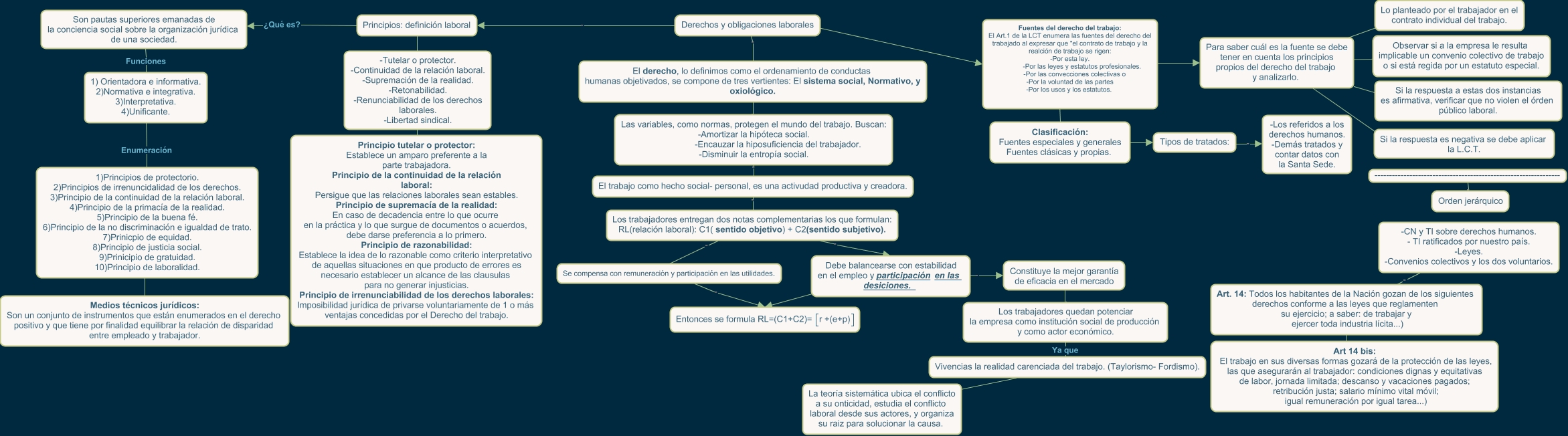 Este Cmap, tiene información relacionada con: mapa, Los trabajadores quedan potenciar la empresa como institución social de producción y como actor económico. Ya que ????, Vivencias la realidad carenciada del trabajo. (Taylorismo- Fordismo). . La teoría sistemática ubica el conflicto a su onticidad, estudia el conflicto laboral desde sus actores, y organiza su raiz para solucionar la causa., Art. 14: Todos los habitantes de la Nación gozan de los siguientes derechos conforme a las leyes que reglamenten su ejercicio; a saber: de trabajar y ejercer toda industria lícita...) ???? Art 14 bis: El trabajo en sus diversas formas gozará de la protección de las leyes, las que asegurarán al trabajador: condiciones dignas y equitativas de labor, jornada limitada; descanso y vacaciones pagados; retribución justa; salario mínimo vital móvil; igual remuneración por igual tarea...), Los trabajadores entregan dos notas complementarias los que formulan: RL(relación laboral): C1( sentido objetivo) + C2(sentido subjetivo). . Se compensa con remuneración y participación en las utilidades., -CN y TI sobre derechos humanos. - TI ratificados por nuestro país. -Leyes. -Convenios colectivos y los dos voluntarios. . Art. 14: Todos los habitantes de la Nación gozan de los siguientes derechos conforme a las leyes que reglamenten su ejercicio; a saber: de trabajar y ejercer toda industria lícita...), ---------------------------------------------------------------- . Orden jerárquico, Para saber cuál es la fuente se debe tener en cuenta los principios propios del derecho del trabajo y analizarlo. ???? Si la respuesta es negativa se debe aplicar la L.C.T., -Tutelar o protector. -Continuidad de la relación laboral. -Supremación de la realidad. -Retonabilidad. -Renunciabilidad de los derechos laborales. -Libertad sindical. ???? Principio tutelar o protector: Establece un amparo preferente a la parte trabajadora. Principio de la continuidad de la relación laboral: Persigue que las relaciones laborales sean estables. Principio de supremacía de la realidad: En caso de decadencia entre lo que ocurre en la práctica y lo que surgue de documentos o acuerdos, debe darse preferencia a lo primero. Principio de razonabilidad: Establece la idea de lo razonable como criterio interpretativo de aquellas situaciones en que producto de errores es necesario establecer un alcance de las clausulas para no generar injusticias. Principio de irrenunciabilidad de los derechos laborales: Imposibilidad jurídica de privarse voluntariamente de 1 o más ventajas concedidas por el Derecho del trabajo., Derechos y obligaciones laborales . Fuentes del derecho del trabajo: El Art.1 de la LCT enumera las fuentes del derecho del trabajado al expresar que "el contrato de trabajo y la realción de trabajo se rigen: -Por esta ley. -Por las leyes y estatutos profesionales. -Por las convecciones colectivas o -Por la voluntad de las partes -Por los usos y los estatutos., Son pautas superiores emanadas de la conciencia social sobre la organización jurídica de una sociedad. Funciones 1) Orientadora e informativa. 2)Normativa e integrativa. 3)Interpretativa. 4)Unificante., Clasificación: Fuentes especiales y generales Fuentes clásicas y propias. . Tipos de tratados:, Para saber cuál es la fuente se debe tener en cuenta los principios propios del derecho del trabajo y analizarlo. ???? Lo planteado por el trabajador en el contrato individual del trabajo., Las variables, como normas, protegen el mundo del trabajo. Buscan: -Amortizar la hipóteca social. -Encauzar la hiposuficiencia del trabajador. -Disminuir la entropía social. . El trabajo como hecho social- personal, es una activudad productiva y creadora., Para saber cuál es la fuente se debe tener en cuenta los principios propios del derecho del trabajo y analizarlo. ???? Observar si a la empresa le resulta implicable un convenio colectivo de trabajo o si está regida por un estatuto especial., 1)Principios de protectorio. 2)Principios de irrenuncidalidad de los derechos. 3)Principio de la continuidad de la relación laboral. 4)Principio de la primacía de la realidad. 5)Principio de la buena fé. 6)Principio de la no discriminación e igualdad de trato. 7)Prinicpio de equidad. 8)Principio de justicia social. 9)Prinicipio de gratuidad. 10)Principio de laboralidad. ???? Medios técnicos jurídicos: Son un conjunto de instrumentos que están enumerados en el derecho positivo y que tiene por finalidad equilibrar la relación de disparidad entre empleado y trabajador., 1) Orientadora e informativa. 2)Normativa e integrativa. 3)Interpretativa. 4)Unificante. Enumeración 1)Principios de protectorio. 2)Principios de irrenuncidalidad de los derechos. 3)Principio de la continuidad de la relación laboral. 4)Principio de la primacía de la realidad. 5)Principio de la buena fé. 6)Principio de la no discriminación e igualdad de trato. 7)Prinicpio de equidad. 8)Principio de justicia social. 9)Prinicipio de gratuidad. 10)Principio de laboralidad., Constituye la mejor garantía de eficacia en el mercado . Los trabajadores quedan potenciar la empresa como institución social de producción y como actor económico., Derechos y obligaciones laborales . El derecho, lo definimos como el ordenamiento de conductas humanas objetivados, se compone de tres vertientes: El sistema social, Normativo, y oxiológico., Se compensa con remuneración y participación en las utilidades. . <math xmlns="http://www.w3.org/1998/Math/MathML"> <mrow> <mtext> Entonces se formula RL=(C1+C2)= </mtext> <mfenced open="[" close="]"> <mtext> r +(e+p) </mtext> </mfenced> </mrow> </math>, Los trabajadores entregan dos notas complementarias los que formulan: RL(relación laboral): C1( sentido objetivo) + C2(sentido subjetivo). . Debe balancearse con estabilidad en el empleo y participación en las desiciones.