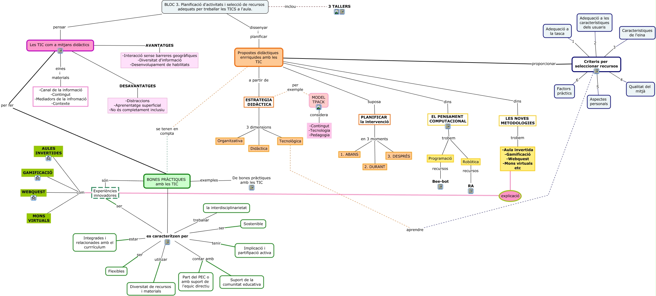 Este Cmap, tiene información relacionada con: 1. Bloc 3. Planificació d'activitats i selecció de recursos adequats per treballar les TICS a l'aula, BLOC 3. Planificació d'activitats i selecció de recursos adequats per treballar les TICS a l'aula. dissenyar i planificar Propostes didàctiques enrriquides amb les TIC, Experiències innovadores explicació, Experiències innovadores com GAMIFICACIÓ, Criteris per seleccionar recursos 4 Qualitat del mitjà, Propostes didàctiques enrriquides amb les TIC dins LES NOVES METODOLOGIES, BONES PRÀCTIQUES amb les TIC es caracterítzen per, Les TIC com a mitjans didàctics DESAVANTATGES -Distraccions -Aprenentatge superficial -No és completament inclusiu, LES NOVES METODOLOGIES trobem -Aula invertida -Gamificació -Webquest -Mons virtuals etc, Criteris per seleccionar recursos 3 Caracteristiques de l'eina, Criteris per seleccionar recursos 6 Factors pràctics, Propostes didàctiques enrriquides amb les TIC suposa PLANIFICAR la intervenció, EL PENSAMENT COMPUTACIONAL trobem Robòtica, es caracterítzen per ser Flexibles, Criteris per seleccionar recursos 5 Aspectes personals, Criteris per seleccionar recursos 2 Adequació a les característiques dels usuaris, Propostes didàctiques enrriquides amb les TIC se tenen en compta BONES PRÀCTIQUES amb les TIC, es caracterítzen per contar amb Part del PEC o amb suport de l'equic directiu, es caracterítzen per ser Sostenible, Les TIC com a mitjans didàctics per fer BONES PRÀCTIQUES amb les TIC, ESTRATEGIA DIDÀCTICA 3 dimensions Tecnològica