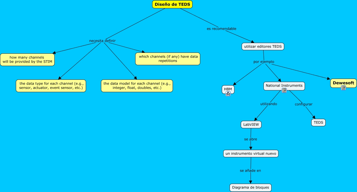 Este Cmap, tiene información relacionada con: Diseño TEDS, un instrumento virtual nuevo se añade en Diagrama de bloques, Diseño de TEDS necesita definir the data type for each channel (e.g., sensor, actuator, event sensor, etc.), Diseño de TEDS necesita definir how many channels will be provided by the STIM, Diseño de TEDS necesita definir the data model for each channel (e.g., integer, float, doubles, etc.), utilizar editores TEDS por ejemplo Dewesoft, National Instruments utilizando LabVIEW, National Instruments configurar TEDS, Diseño de TEDS es recomendable utilizar editores TEDS, utilizar editores TEDS por ejemplo National Instruments, Diseño de TEDS necesita definir which channels (if any) have data repetitions, LabVIEW se abre un instrumento virtual nuevo, utilizar editores TEDS por ejemplo HBM