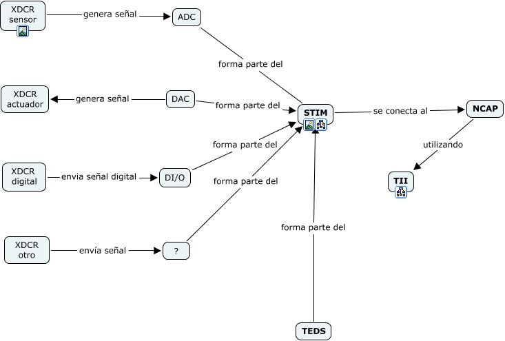 Este Cmap, tiene información relacionada con: Diseño STIM, XDCR otro envía señal ?, STIM se conecta al NCAP, ADC forma parte del STIM, NCAP utilizando TII, XDCR digital envia señal digital DI/O, XDCR sensor genera señal ADC, ? forma parte del STIM, DI/O forma parte del STIM, DAC genera señal XDCR actuador, TEDS forma parte del STIM, DAC forma parte del STIM