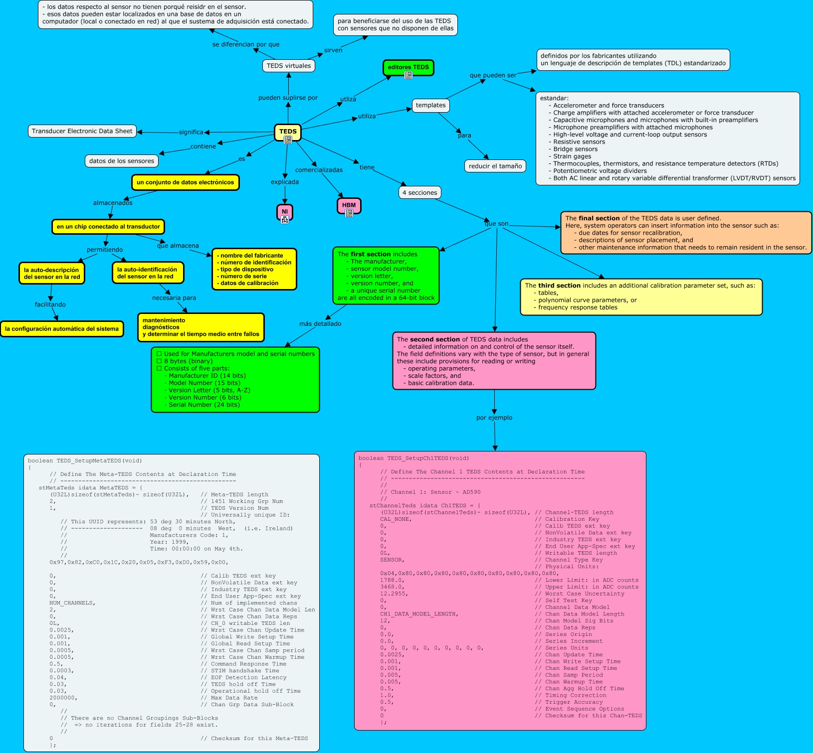 Este Cmap, tiene información relacionada con: TEDS, en un chip conectado al transductor que almacena - nombre del fabricante - número de identificación - tipo de dispositivo - número de serie - datos de calibración, TEDS virtuales se diferencian por que - los datos respecto al sensor no tienen porqué reisidr en el sensor. - esos datos pueden estar localizados en una base de datos en un computador (local o conectado en red) al que el sustema de adquisición está conectado., templates que pueden ser estandar: - Accelerometer and force transducers - Charge amplifiers with attached accelerometer or force transducer - Capacitive microphones and microphones with built-in preamplifiers - Microphone preamplifiers with attached microphones - High-level voltage and current-loop output sensors - Resistive sensors - Bridge sensors - Strain gages - Thermocouples, thermistors, and resistance temperature detectors (RTDs) - Potentiometric voltage dividers - Both AC linear and rotary variable differential transformer (LVDT/RVDT) sensors, TEDS comercializadas HBM, The second section of TEDS data includes - detailed information on and control of the sensor itself. The field definitions vary with the type of sensor, but in general these include provisions for reading or writing - operating parameters, - scale factors, and - basic calibration data. por ejemplo boolean TEDS_SetupCh1TEDS(void) { // Define The Channel 1 TEDS Contents at Declaration Time // ------------------------------------------------------ // // Channel 1: Sensor - AD590 // stChannelTeds idata Ch1TEDS = { (U32L)sizeof(stChannelTeds)- sizeof(U32L), // Channel-TEDS length CAL_NONE, // Calibration Key 0, // Calib TEDS ext key 0, // NonVolatile Data ext key 0, // Industry TEDS ext key 0, // End User App-Spec ext key 0L, // Writable TEDS length SENSOR, // Channel Type Key // Physical Units: 0x04,0x80,0x80,0x80,0x80,0x80,0x80,0x80,0x80,0x80, 1788.0, // Lower Limit: in ADC counts 3468.0, // Upper Limit: in ADC counts 12.2955, // Worst Case Uncertainty 0, // Self Test Key 0, // Channel Data Model CH1_DATA_MODEL_LENGTH, // Chan Data Model Length 12, // Chan Model Sig Bits 0, // Chan Data Reps 0.0, // Series Origin 0.0, // Series Increment 0, 0, 0, 0, 0, 0, 0, 0, 0, 0, // Series Units 0.0025, // Chan Update Time 0.001, // Chan Write Setup Time 0.001, // Chan Read Setup Time 0.005, // Chan Samp Period 0.005, // Chan Warmup Time 0.5, // Chan Agg Hold Off Time 1.0, // Timing Correction 0.5, // Trigger Accuracy 0, // Event Sequence Options 0 // Checksum for this Chan-TEDS };, templates para reducir el tamaño, la auto-identificación del sensor en la red necesaria para mantenimiento diagnósticos y determinar el tiempo medio entre fallos, 4 secciones que son The second section of TEDS data includes - detailed information on and control of the sensor itself. The field definitions vary with the type of sensor, but in general these include provisions for reading or writing - operating parameters, - scale factors, and - basic calibration data., TEDS significa Transducer Electronic Data Sheet, TEDS utiliza templates, TEDS contiene datos de los sensores, TEDS tiene 4 secciones, 4 secciones que son The third section includes an additional calibration parameter set, such as: - tables, - polynomial curve parameters, or - frequency response tables, TEDS es un conjunto de datos electrónicos, en un chip conectado al transductor permitiendo la auto-descripción del sensor en la red, 4 secciones que son The first section includes - The manufacturer, - sensor model number, - version letter, - version number, and - a unique serial number are all encoded in a 64-bit block, en un chip conectado al transductor permitiendo la auto-identificación del sensor en la red, TEDS pueden suplirse por TEDS virtuales, The first section includes - The manufacturer, - sensor model number, - version letter, - version number, and - a unique serial number are all encoded in a 64-bit block más detallado Used for Manufacturers model and serial numbers 8 bytes (binary) Consists of five parts: · Manufacturer ID (14 bits) · Model Number (15 bits) · Version Letter (5 bits, A-Z) · Version Number (6 bits) · Serial Number (24 bits), la auto-descripción del sensor en la red facilitando la configuración automática del sistema