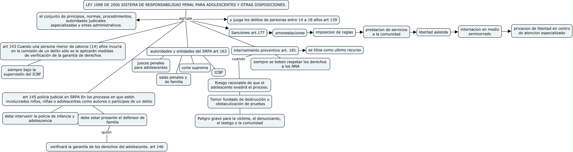 Este Cmap, tiene información relacionada con: ley 1098 de 2006, art 143 Cuando una persona menor de catorce (14) años incurra en la comisión de un delito sólo se le aplicarán medidas de verificación de la garantía de derechos ???? siempre bajo la supervisión del ICBF, internamiento preventivo art. 181 ???? siempre se beben respetar los derechos a los NNA, autoridades y entidades del SRPA art 163 ???? jueces penales para adolescentes, art 143 Cuando una persona menor de catorce (14) años incurra en la comisión de un delito sólo se le aplicarán medidas de verificación de la garantía de derechos agrupa Sanciones art.177, amonestaciones ???? imposicion de reglas, Temor fundado de destrucción u obstaculización de pruebas ???? Peligro grave para la víctima, el denunciante, el testigo o la comunidad, prestacion de servicios a la comunidad ???? libertad asistida, internamiento preventivo art. 181 cuando Riesgo razonable de que el adolescente evadirá el proceso., LEY 1098 DE 2006 SISTEMA DE RESPONSABILIDAD PENAL PARA ADOLESCENTES Y OTRAS DISPOSICIONES. agrupa internamiento preventivo art. 181, art 145 policia judicial en SRPA En los procesos en que estén involucrados niños, niñas o adolescentes como autores o partícipes de un delito ???? debe intervenir la policia de infancia y adolescencia, LEY 1098 DE 2006 SISTEMA DE RESPONSABILIDAD PENAL PARA ADOLESCENTES Y OTRAS DISPOSICIONES. agrupa art 145 policia judicial en SRPA En los procesos en que estén involucrados niños, niñas o adolescentes como autores o partícipes de un delito, autoridades y entidades del SRPA art 163 ???? corte suprema, art 143 Cuando una persona menor de catorce (14) años incurra en la comisión de un delito sólo se le aplicarán medidas de verificación de la garantía de derechos agrupa art 145 policia judicial en SRPA En los procesos en que estén involucrados niños, niñas o adolescentes como autores o partícipes de un delito, autoridades y entidades del SRPA art 163 ???? salas penales y de familia, imposicion de reglas ???? prestacion de servicios a la comunidad, art 143 Cuando una persona menor de catorce (14) años incurra en la comisión de un delito sólo se le aplicarán medidas de verificación de la garantía de derechos agrupa internamiento preventivo art. 181, Sanciones art.177 ???? amonestaciones, LEY 1098 DE 2006 SISTEMA DE RESPONSABILIDAD PENAL PARA ADOLESCENTES Y OTRAS DISPOSICIONES. agrupa el conjunto de principios, normas, procedimientos, autoridades judiciales especializadas y entes administrativos, art 143 Cuando una persona menor de catorce (14) años incurra en la comisión de un delito sólo se le aplicarán medidas de verificación de la garantía de derechos agrupa autoridades y entidades del SRPA art 163, Riesgo razonable de que el adolescente evadirá el proceso. ???? Temor fundado de destrucción u obstaculización de pruebas