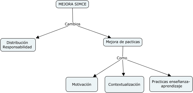 Este Cmap, tiene información relacionada con: SIMCE Mejora, Mejora de pacticas Como Contextualización, MEJORA SIMCE Cambios Mejora de pacticas, MEJORA SIMCE Cambios Distribución Responsabilidad, Mejora de pacticas Como Practicas enseñanza- aprendizaje, Mejora de pacticas Como Motivación