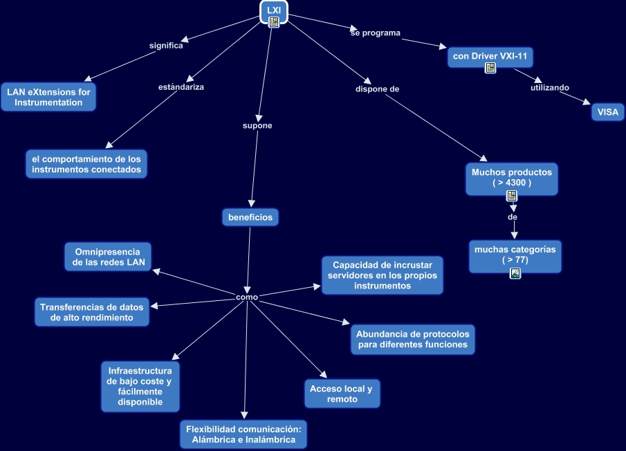 Este Cmap, tiene información relacionada con: 4.- LXI, LXI significa LAN eXtensions for Instrumentation, beneficios como Omnipresencia de las redes LAN, LXI dispone de Muchos productos ( > 4300 ), LXI supone beneficios, LXI se programa con Driver VXI-11, beneficios como Capacidad de incrustar servidores en los propios instrumentos, Muchos productos ( > 4300 ) de muchas categorías ( > 77), beneficios como Infraestructura de bajo coste y fácilmente disponible, beneficios como Acceso local y remoto, beneficios como Abundancia de protocolos para diferentes funciones, con Driver VXI-11 utilizando VISA, LXI estándariza el comportamiento de los instrumentos conectados, beneficios como Flexibilidad comunicación: Alámbrica e Inalámbrica, beneficios como Transferencias de datos de alto rendimiento