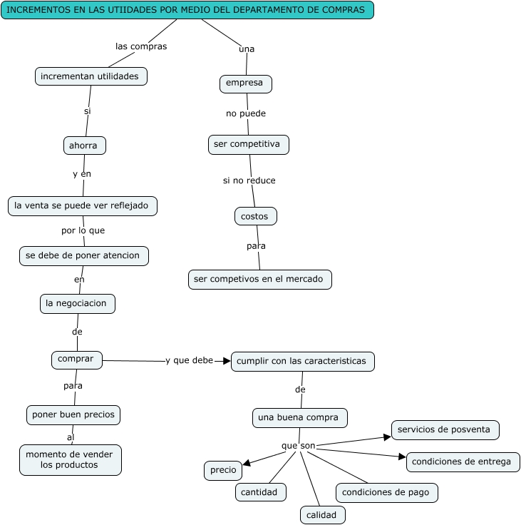 Este Cmap, tiene información relacionada con: Incremento de las utilidades por medio del departamento de compras, comprar y que debe cumplir con las caracteristicas, empresa no puede ser competitiva, incrementan utilidades si ahorra, la venta se puede ver reflejado por lo que se debe de poner atencion, una buena compra que son calidad, se debe de poner atencion en la negociacion, una buena compra que son servicios de posventa, INCREMENTOS EN LAS UTIIDADES POR MEDIO DEL DEPARTAMENTO DE COMPRAS una empresa, ser competitiva si no reduce costos, una buena compra que son precio, una buena compra que son condiciones de entrega, comprar para poner buen precios, una buena compra que son condiciones de pago, la negociacion de comprar, INCREMENTOS EN LAS UTIIDADES POR MEDIO DEL DEPARTAMENTO DE COMPRAS las compras incrementan utilidades, cumplir con las caracteristicas de una buena compra, costos para ser competivos en el mercado, una buena compra que son cantidad, ahorra y en la venta se puede ver reflejado, poner buen precios al momento de vender los productos