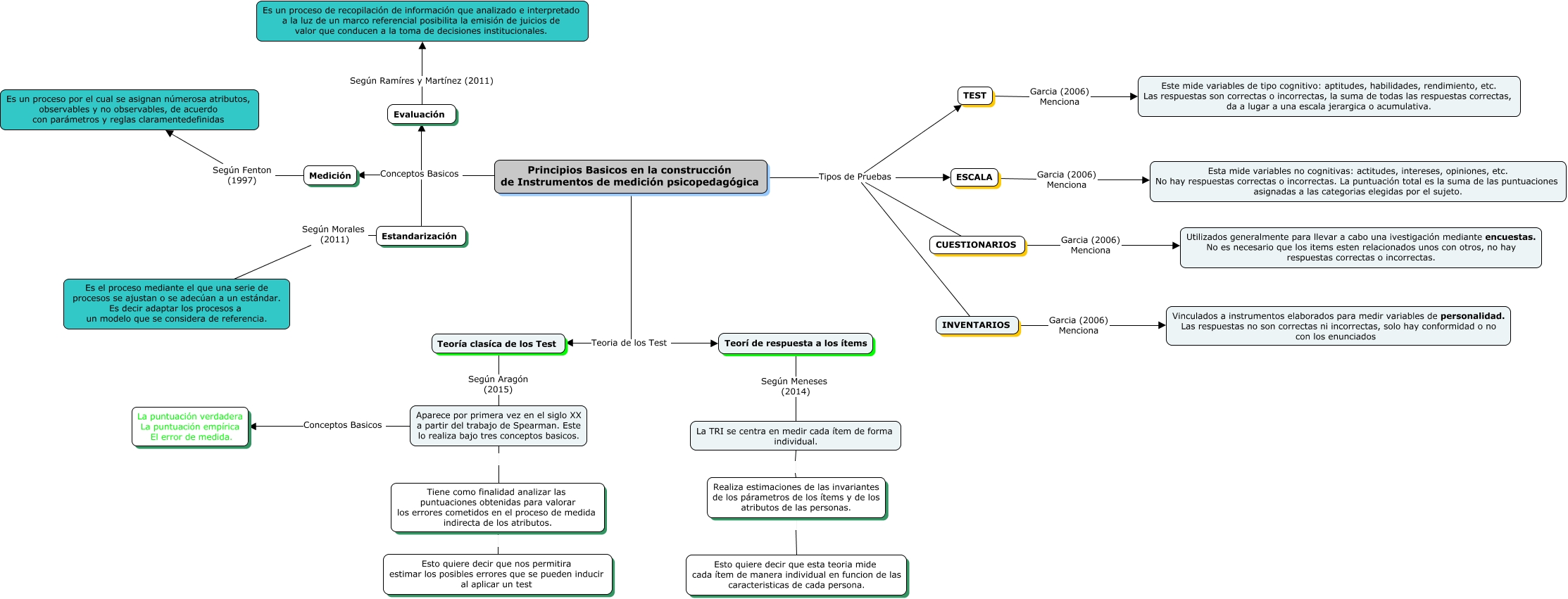 Este Cmap, tiene información relacionada con: Esquema, Aparece por primera vez en el siglo XX a partir del trabajo de Spearman. Este lo realiza bajo tres conceptos basicos. Tiene como finalidad analizar las puntuaciones obtenidas para valorar los errores cometidos en el proceso de medida indirecta de los atributos., Principios Basicos en la construcción de Instrumentos de medición psicopedagógica Conceptos Basicos Evaluación, Teoría clasíca de los Test Según Aragón (2015) Aparece por primera vez en el siglo XX a partir del trabajo de Spearman. Este lo realiza bajo tres conceptos basicos., Principios Basicos en la construcción de Instrumentos de medición psicopedagógica Teoria de los Test Teoría clasíca de los Test, Principios Basicos en la construcción de Instrumentos de medición psicopedagógica Conceptos Basicos Medición, Evaluación Según Ramíres y Martínez (2011) Es un proceso de recopilación de información que analizado e interpretado a la luz de un marco referencial posibilita la emisión de juicios de valor que conducen a la toma de decisiones institucionales., Tiene como finalidad analizar las puntuaciones obtenidas para valorar los errores cometidos en el proceso de medida indirecta de los atributos. Esto quiere decir que nos permitira estimar los posibles errores que se pueden inducir al aplicar un test, Realiza estimaciones de las invariantes de los párametros de los ítems y de los atributos de las personas. Esto quiere decir que esta teoria mide cada ítem de manera individual en funcion de las caracteristicas de cada persona., Principios Basicos en la construcción de Instrumentos de medición psicopedagógica Teoria de los Test Teorí de respuesta a los ítems, Medición Según Fenton (1997) Es un proceso por el cual se asignan númerosa atributos, observables y no observables, de acuerdo con parámetros y reglas claramentedefinidas, ESCALA Garcia (2006) Menciona Esta mide variables no cognitivas: actitudes, intereses, opiniones, etc. No hay respuestas correctas o incorrectas. La puntuación total es la suma de las puntuaciones asignadas a las categorias elegidas por el sujeto., Principios Basicos en la construcción de Instrumentos de medición psicopedagógica Tipos de Pruebas TEST, TEST Garcia (2006) Menciona Este mide variables de tipo cognitivo: aptitudes, habilidades, rendimiento, etc. Las respuestas son correctas o incorrectas, la suma de todas las respuestas correctas, da a lugar a una escala jerargica o acumulativa., Principios Basicos en la construcción de Instrumentos de medición psicopedagógica Conceptos Basicos Estandarización, Principios Basicos en la construcción de Instrumentos de medición psicopedagógica Tipos de Pruebas INVENTARIOS, Teorí de respuesta a los ítems Según Meneses (2014) La TRI se centra en medir cada ítem de forma individual., Principios Basicos en la construcción de Instrumentos de medición psicopedagógica Tipos de Pruebas CUESTIONARIOS, CUESTIONARIOS Garcia (2006) Menciona Utilizados generalmente para llevar a cabo una ivestigación mediante encuestas. No es necesario que los items esten relacionados unos con otros, no hay respuestas correctas o incorrectas., Estandarización Según Morales (2011) Es el proceso mediante el que una serie de procesos se ajustan o se adecúan a un estándar. Es decir adaptar los procesos a un modelo que se considera de referencia., La TRI se centra en medir cada ítem de forma individual. Realiza estimaciones de las invariantes de los párametros de los ítems y de los atributos de las personas.
