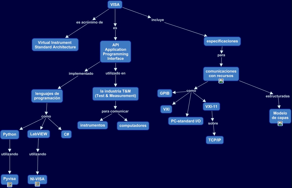Este Cmap, tiene información relacionada con: 5.- VISA, lenguajes de programación como C#, especificaciones para comunicaciones con recursos, la industria T&M (Test & Measurement) para comunicar instrumentos, API Application Programming Interface implementado lenguajes de programación, Python utilizando Pyvisa, VISA es API Application Programming Interface, comunicaciones con recursos estructuradas Modelo de capas, VISA es acrónimo de Virtual Instrument Standard Architecture, comunicaciones con recursos como GPIB, comunicaciones con recursos como PC-standard I/O, comunicaciones con recursos como VXI, lenguajes de programación como LabVIEW, API Application Programming Interface utilizado en la industria T&M (Test & Measurement), VISA incluye especificaciones, LabVIEW utilizando NI-VISA, comunicaciones con recursos como VXI-11, lenguajes de programación como Python, la industria T&M (Test & Measurement) para comunicar computadores, VXI-11 sobre TCP/IP