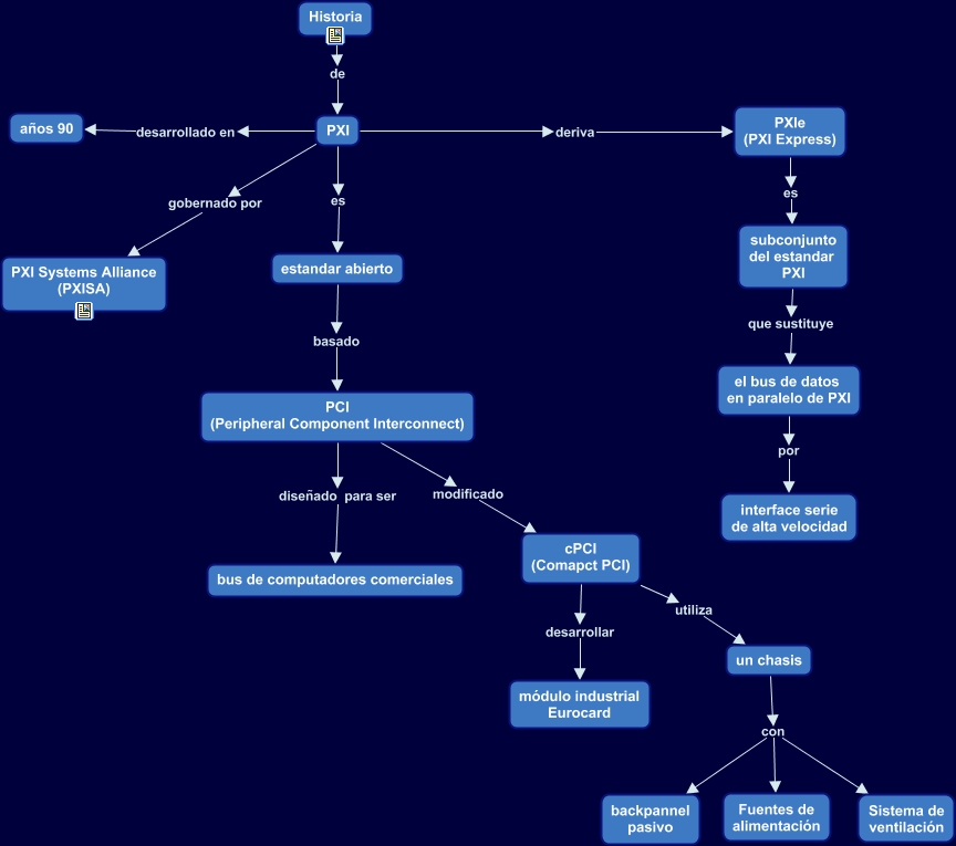 Este Cmap, tiene información relacionada con: 3.1.- Historia PXI, un chasis con backpannel pasivo, PXI desarrollado en años 90, PXI gobernado por PXI Systems Alliance (PXISA), estandar abierto basado PCI (Peripheral Component Interconnect), cPCI (Comapct PCI) utiliza un chasis, el bus de datos en paralelo de PXI por interface serie de alta velocidad, PCI (Peripheral Component Interconnect) modificado cPCI (Comapct PCI), PCI (Peripheral Component Interconnect) diseñado para ser bus de computadores comerciales, subconjunto del estandar PXI que sustituye el bus de datos en paralelo de PXI, PXIe (PXI Express) es subconjunto del estandar PXI, un chasis con Fuentes de alimentación, Historia de PXI, PXI deriva PXIe (PXI Express), PXI es estandar abierto, cPCI (Comapct PCI) desarrollar módulo industrial Eurocard, un chasis con Sistema de ventilación