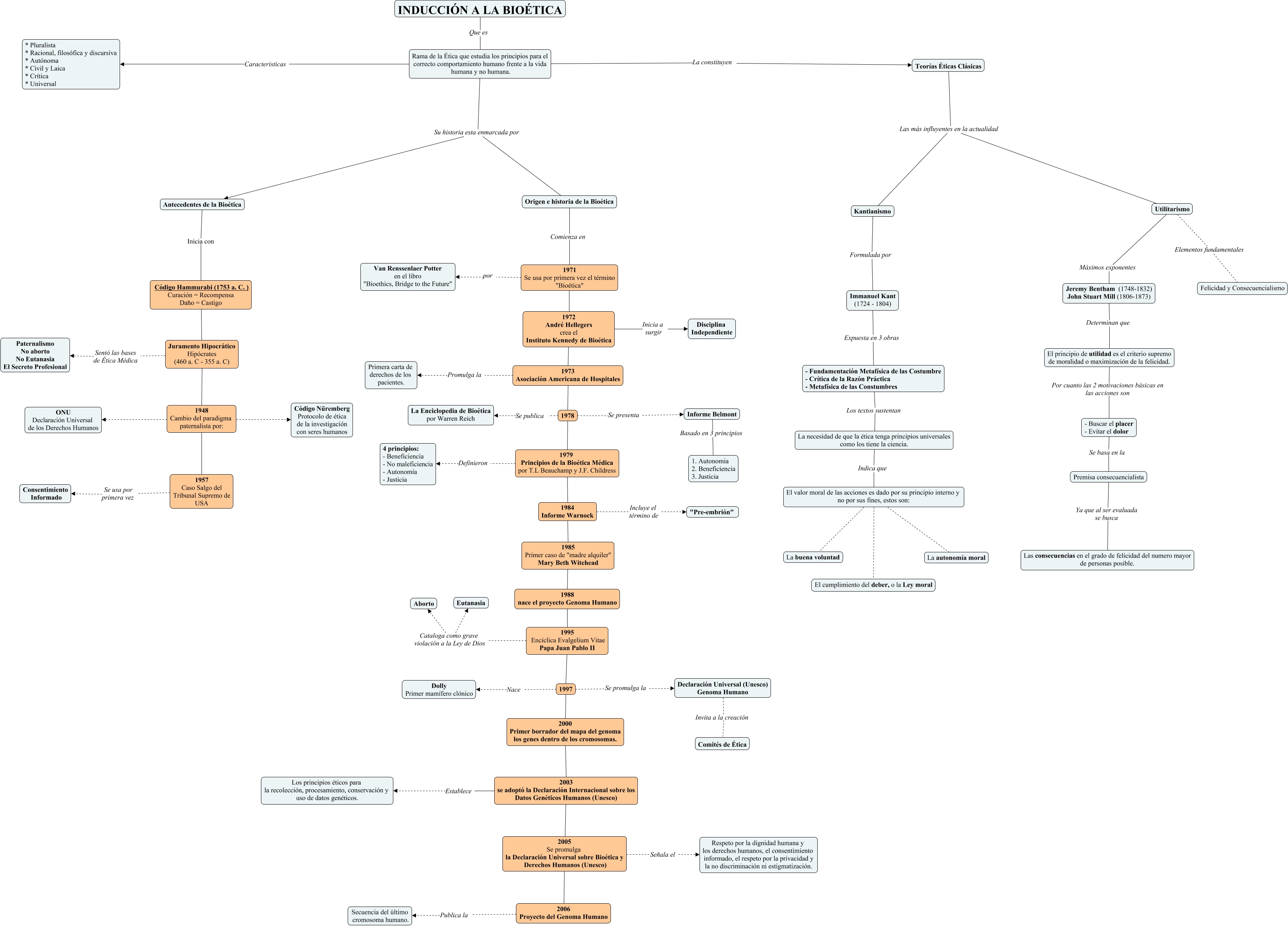 Este Cmap, tiene información relacionada con: BIOETICA, El valor moral de las acciones es dado por su principio interno y no por sus fines, estos son: La buena voluntad, 1971 Se usa por primera vez el término "Bioética" por Van Renssenlaer Potter en el libro "Bioethics, Bridge to the Future", 1973 Asociación Americana de Hospitales Promulga la Primera carta de derechos de los pacientes., Jeremy Bentham (1748-1832) John Stuart Mill (1806-1873) Determinan que El principio de utilidad es el criterio supremo de moralidad o maximización de la felicidad., Rama de la Ética que estudia los principios para el correcto comportamiento humano frente a la vida humana y no humana. La constituyen Teorías Éticas Clásicas, 1995 Encíclica Evalgelium Vitae Papa Juan Pablo II Cataloga como grave violación a la Ley de Dios Eutanasia, Origen e historia de la Bioética Comienza en 1971 Se usa por primera vez el término "Bioética", 1979 Principios de la Bioética Médica por T.L Beauchamp y J.F. Childress 1984 Informe Warnock, Immanuel Kant (1724 - 1804) Expuesta en 3 obras - Fundamentación Metafísica de las Costumbre - Crítica de la Razón Práctica - Metafísica de las Constumbres, 1972 André Hellegers crea el Instituto Kennedy de Bioética 1973 Asociación Americana de Hospitales, 1973 Asociación Americana de Hospitales 1978, Informe Belmont Basado en 3 principios 1. Autonomia 2. Beneficiencia 3. Justicia, Kantianismo Formulada por Immanuel Kant (1724 - 1804), Antecedentes de la Bioética Inicia con Código Hammurabi (1753 a. C. ) Curación = Recompensa Daño = Castigo, El valor moral de las acciones es dado por su principio interno y no por sus fines, estos son: La autonomía moral, 2000 Primer borrador del mapa del genoma los genes dentro de los cromosomas. 2003 se adoptó la Declaración Internacional sobre los Datos Genéticos Humanos (Unesco), El valor moral de las acciones es dado por su principio interno y no por sus fines, estos son: El cumplimiento del deber, o la Ley moral, 1978 Se publica La Enciclopedia de Bioética por Warren Reich, 1997 2000 Primer borrador del mapa del genoma los genes dentro de los cromosomas., Teorías Éticas Clásicas Las más influyentes en la actualidad Utilitarismo
