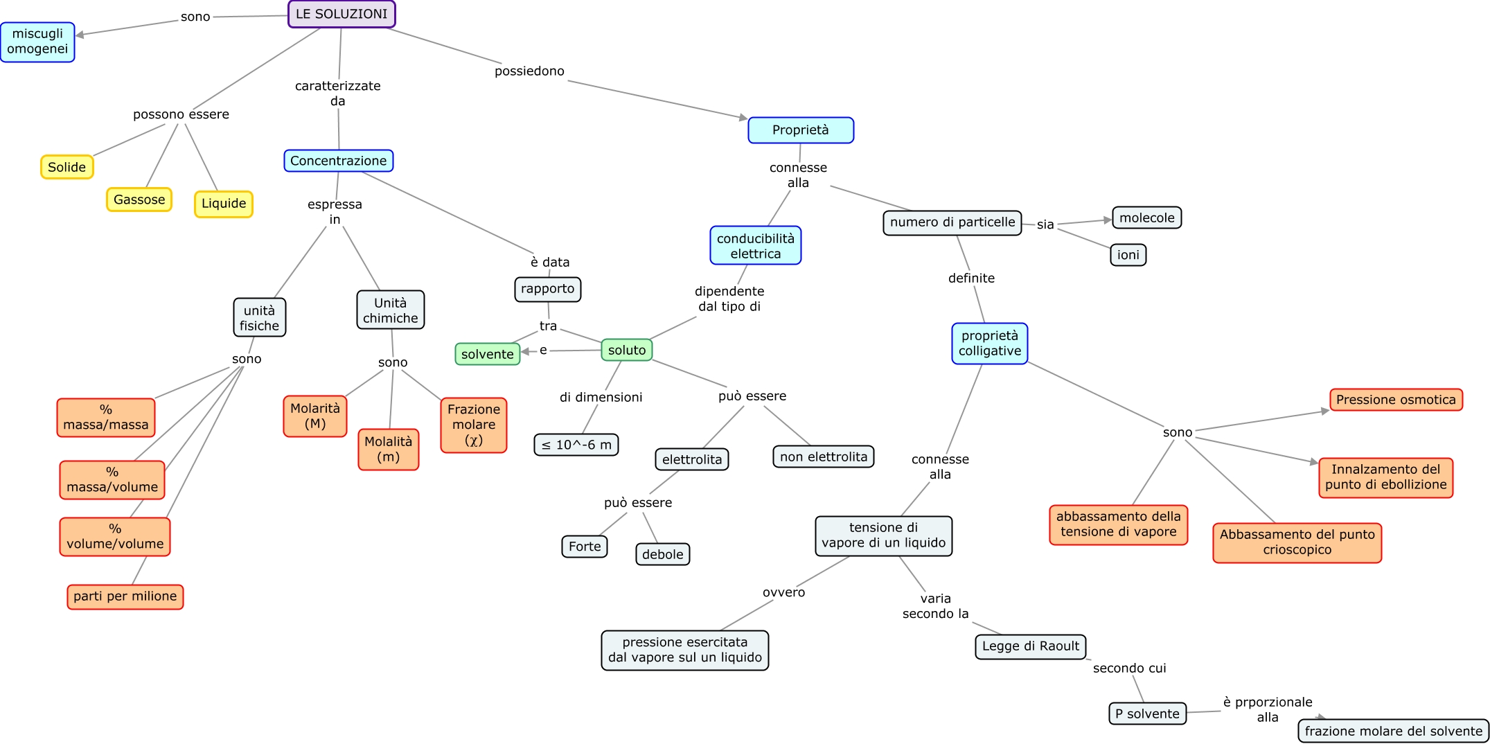 Questa Cmap, creata con IHMC CmapTools, contiene informazioni relative a: Soluzioni, proprietà colligative sono Pressione osmotica, soluto può essere elettrolita, conducibilità elettrica dipendente dal tipo di soluto, Legge di Raoult secondo cui P solvente, LE SOLUZIONI possono essere Solide, unità fisiche sono % volume/volume, numero di particelle sia molecole, Proprietà connesse alla numero di particelle, proprietà colligative sono Innalzamento del punto di ebollizione, soluto di dimensioni ≤ 10^-6 m, soluto e solvente, rapporto tra solvente, Unità chimiche sono Molalità (m), unità fisiche sono % massa/massa, numero di particelle definite proprietà colligative, Unità chimiche sono Frazione molare (χ), soluto può essere non elettrolita, LE SOLUZIONI caratterizzate da Concentrazione, unità fisiche sono % massa/volume, LE SOLUZIONI possiedono Proprietà