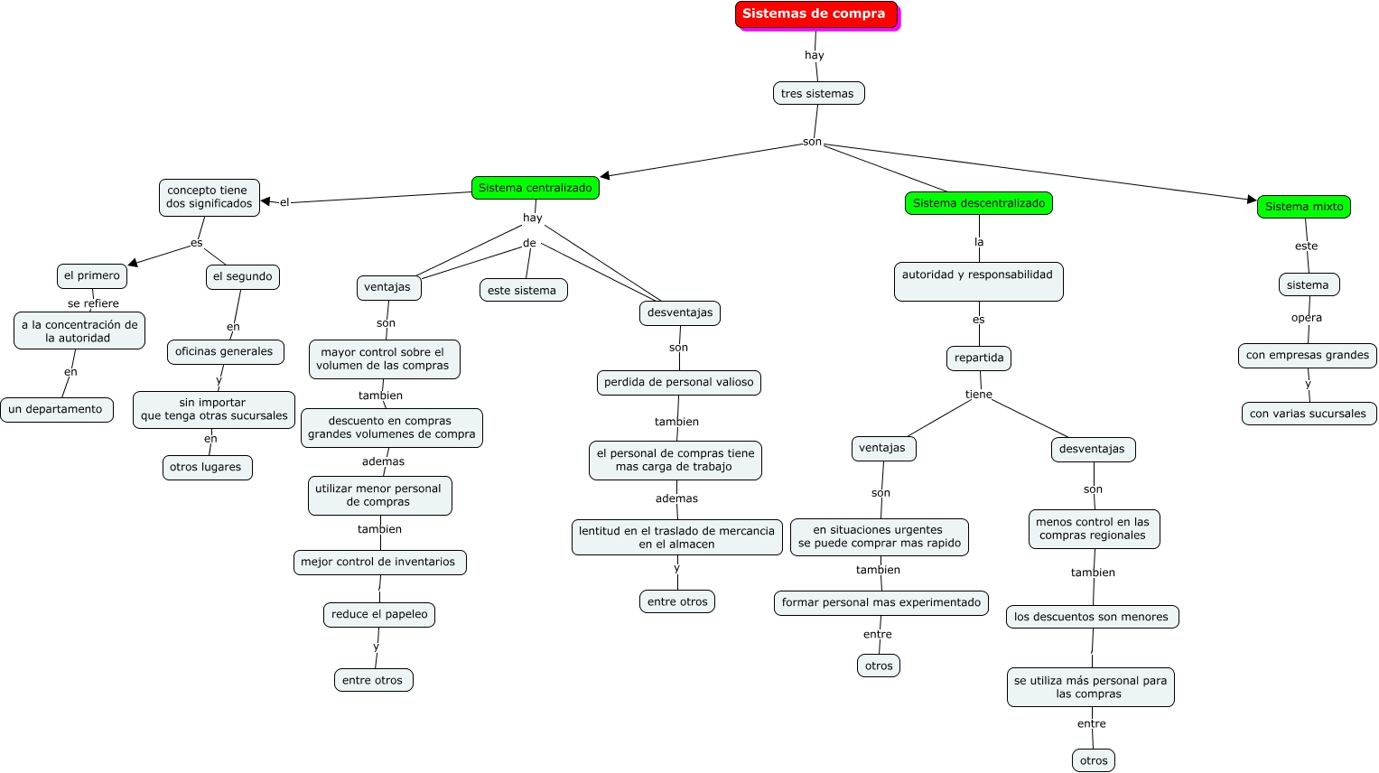 Este Cmap, tiene información relacionada con: Sistemas de compras, se utiliza más personal para las compras entre otros, en situaciones urgentes se puede comprar mas rapido tambien formar personal mas experimentado, reduce el papeleo y entre otros, tres sistemas son Sistema centralizado, concepto tiene dos significados es el primero, menos control en las compras regionales tambien los descuentos son menores, los descuentos son menores , se utiliza más personal para las compras, utilizar menor personal de compras tambien mejor control de inventarios, perdida de personal valioso tambien el personal de compras tiene mas carga de trabajo, Sistema centralizado hay desventajas, el personal de compras tiene mas carga de trabajo ademas lentitud en el traslado de mercancia en el almacen, sin importar que tenga otras sucursales en otros lugares, ventajas son en situaciones urgentes se puede comprar mas rapido, descuento en compras grandes volumenes de compra ademas utilizar menor personal de compras, el segundo en oficinas generales, ventajas de este sistema, Sistema centralizado el concepto tiene dos significados, formar personal mas experimentado entre otros, mayor control sobre el volumen de las compras tambien descuento en compras grandes volumenes de compra, desventajas son perdida de personal valioso
