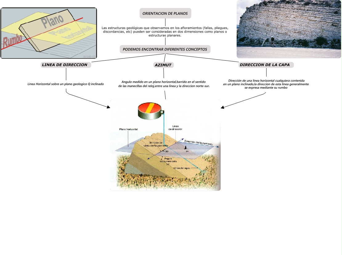 Este Cmap, tiene información relacionada con: orientacion de planos, Linea Horizontal sobre un plano geologico Q inclinado, PODEMOS ENCONTRAR DIFERENTES CONCEPTOS AZIMUT Angulo medido en un plano horizontal,barrido en el sentido de las manecillas del reloj,entre una linea y la direccion norte-sur., PODEMOS ENCONTRAR DIFERENTES CONCEPTOS LINEA DE DIRECCION Linea Horizontal sobre un plano geologico Q inclinado, ORIENTACION DE PLANOS Las estructuras geológicas que observamos en los afloramientos (fallas, pliegues, discordancias, etc) pueden ser consideradas en dos dimensiones como planos o estructuras planares. PODEMOS ENCONTRAR DIFERENTES CONCEPTOS, PODEMOS ENCONTRAR DIFERENTES CONCEPTOS DIRECCION DE LA CAPA Dirección de una linea horizontal cualquiera contenida en un plano inclinado,la direccion de esta linea generalmente se expresa mediante su rumbo, Angulo medido en un plano horizontal,barrido en el sentido de las manecillas del reloj,entre una linea y la direccion norte-sur., Dirección de una linea horizontal cualquiera contenida en un plano inclinado,la direccion de esta linea generalmente se expresa mediante su rumbo