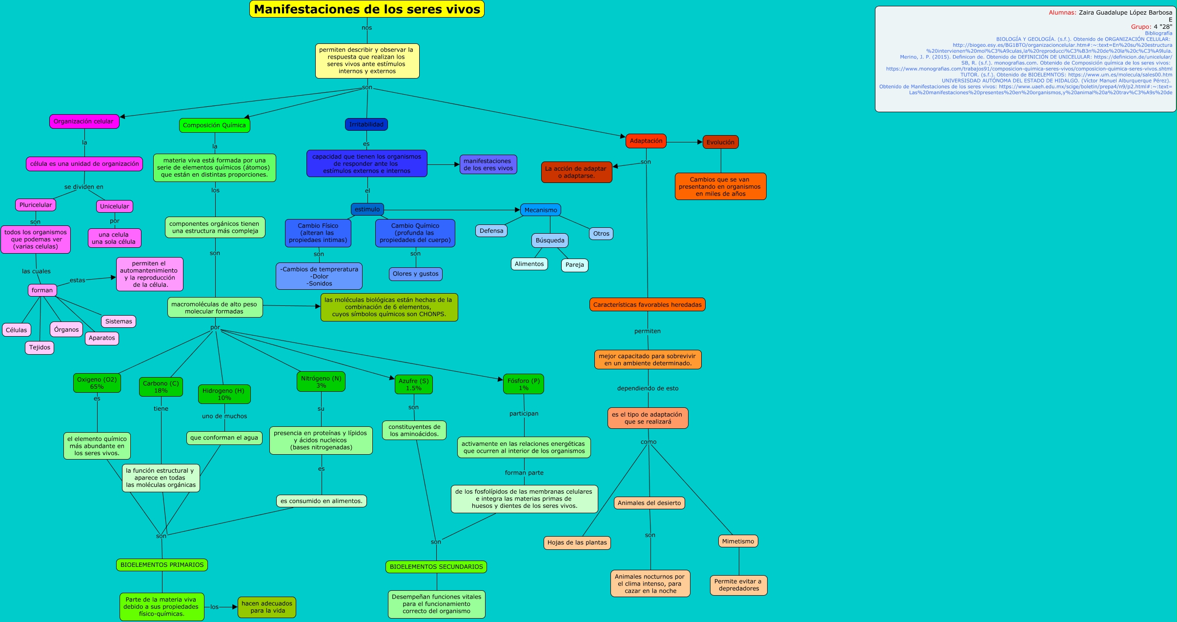 Este Cmap, tiene información relacionada con: CVida2_LópezBarbosaZairaGuadalupe, forman ???? Sistemas, forman ???? Aparatos, célula es una unidad de organización se dividen en Pluricelular, BIOELEMENTOS SECUNDARIOS ???? Desempeñan funciones vitales para el funcionamiento correcto del organismo, es el tipo de adaptación que se realizará como Hojas de las plantas, Nitrógeno (N) 3% su presencia en proteínas y lípidos y ácidos nucleicos (bases nitrogenadas), permiten describir y observar la respuesta que realizan los seres vivos ante estímulos internos y externos son Composición Química, que conforman el agua son BIOELEMENTOS PRIMARIOS, forman ???? Células, Adaptación son La acción de adaptar o adaptarse., permiten describir y observar la respuesta que realizan los seres vivos ante estímulos internos y externos son Adaptación, estimulo ???? Cambio Físico (alteran las propiedaes intimas), macromoléculas de alto peso molecular formadas por Azufre (S) 1.5%, activamente en las relaciones energéticas que ocurren al interior de los organismos forman parte de los fosfolípidos de las membranas celulares e integra las materias primas de huesos y dientes de los seres vivos., capacidad que tienen los organismos de responder ante los estímulos externos e internos ???? manifestaciones de los eres vivos, forman ???? Órganos, Mecanismo ???? Búsqueda, Búsqueda ???? Pareja, Composición Química la materia viva está formada por una serie de elementos químicos (átomos) que están en distintas proporciones., Cambio Físico (alteran las propiedaes intimas) son -Cambios de tempreratura -Dolor -Sonidos