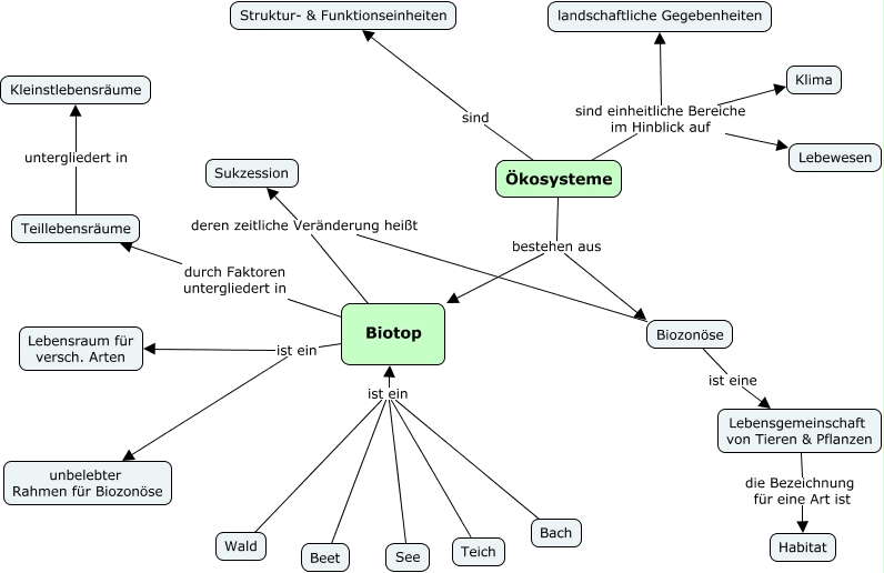Dieses mit IHMC CmapTools erstellte CMap hat Informationen bezüglich: CMap Biotop Q.2. S.Jaensch, Ökosysteme sind Struktur- & Funktionseinheiten, Lebensgemeinschaft von Tieren & Pflanzen die Bezeichnung für eine Art ist Habitat, Biotop ist ein unbelebter Rahmen für Biozonöse, Wald ist ein Biotop, Beet ist ein Biotop, See ist ein Biotop, Ökosysteme sind einheitliche Bereiche im Hinblick auf Lebewesen, Teillebensräume untergliedert in Kleinstlebensräume, Biozonöse deren zeitliche Veränderung heißt Sukzession, Biozonöse ist eine Lebensgemeinschaft von Tieren & Pflanzen, Ökosysteme bestehen aus Biotop, Biotop durch Faktoren untergliedert in Teillebensräume, Biotop deren zeitliche Veränderung heißt Sukzession, Ökosysteme sind einheitliche Bereiche im Hinblick auf landschaftliche Gegebenheiten, Teich ist ein Biotop, Bach ist ein Biotop, Biotop ist ein Lebensraum für versch. Arten, Ökosysteme bestehen aus Biozonöse, Ökosysteme sind einheitliche Bereiche im Hinblick auf Klima