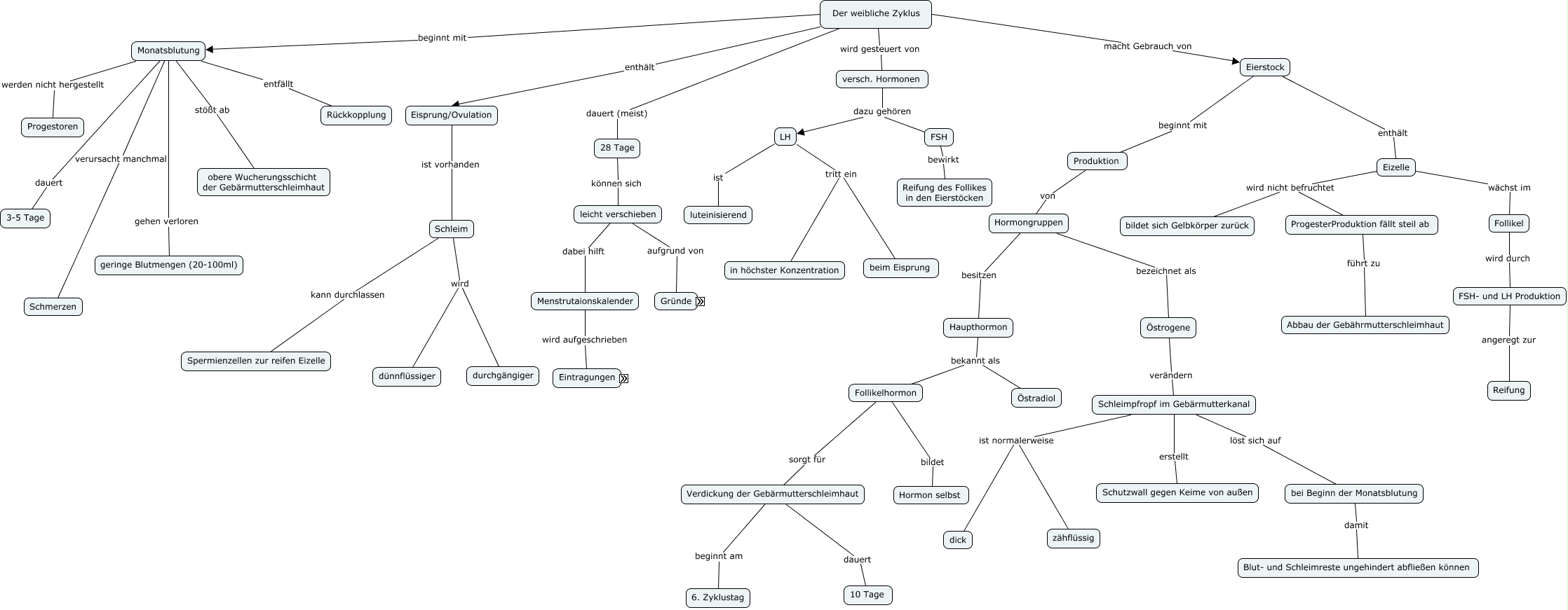 Dieses mit IHMC CmapTools erstellte CMap hat Informationen bezüglich: Zyklus Meyer Färber, Eizelle wird nicht befruchtet ProgesterProduktion fällt steil ab, Der weibliche Zyklus beginnt mit Monatsblutung, Der weibliche Zyklus dauert (meist) 28 Tage, 28 Tage können sich leicht verschieben, FSH bewirkt Reifung des Follikes in den Eierstöcken, Hormongruppen bezeichnet als Östrogene, ProgesterProduktion fällt steil ab führt zu Abbau der Gebährmutterschleimhaut, Eierstock enthält Eizelle, Monatsblutung dauert 3-5 Tage, Haupthormon bekannt als Östradiol, bei Beginn der Monatsblutung damit Blut- und Schleimreste ungehindert abfließen können, Verdickung der Gebärmutterschleimhaut dauert 10 Tage, Follikelhormon sorgt für Verdickung der Gebärmutterschleimhaut, Schleimpfropf im Gebärmutterkanal ist normalerweise zähflüssig, LH ist luteinisierend, Monatsblutung stößt ab obere Wucherungsschicht der Gebärmutterschleimhaut, Verdickung der Gebärmutterschleimhaut beginnt am 6. Zyklustag, FSH- und LH Produktion angeregt zur Reifung, Monatsblutung entfällt Rückkopplung, Produktion von Hormongruppen
