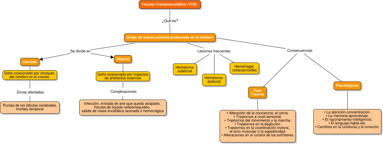 This Concept Map, created with IHMC CmapTools, has information related to: TCE, Golpe de fuerza extrema probocada en el cerebro Se divide en Cerrado, Golpe de fuerza extrema probocada en el cerebro Consecuencias Psicológicas, Hematoma epidural Lesiones frecuentes Hematoma subdural, Psicológicas • La atención-concentración. • La memoria-aprendizaje. • El razonamiento-inteligencia. • El lenguaje-habla etc. • Cambios en la conducta y la emoción., Golpe de fuerza extrema probocada en el cerebro Consecuencias Post Trauma, Golpe de fuerza extrema probocada en el cerebro Se divide en Abierto, Abierto Daño ocacionado por impactos de artefactos externos Infección, entrada de aire que queda atrapado, fístulas de líquido cefalorraquídeo, salida de masa encefálica lacerada o hemorrágica, Hemorragia subaracnoidea Lesiones frecuentes Hematoma subdural, Trauma Craneoencefálico (TCE) ¿Qué es? Golpe de fuerza extrema probocada en el cerebro, Post Trauma • Alteración de la conciencia, el coma. • Trastornos a nivel sensorial. • Trastornos del movimiento y la marcha. • Trastornos en la deglución. • Trastornos en la coordinación motora, el tono muscular o la espasticidad. • Alteraciones en el control de los esfínteres., Golpe de fuerza extrema probocada en el cerebro Lesiones frecuentes Hematoma subdural