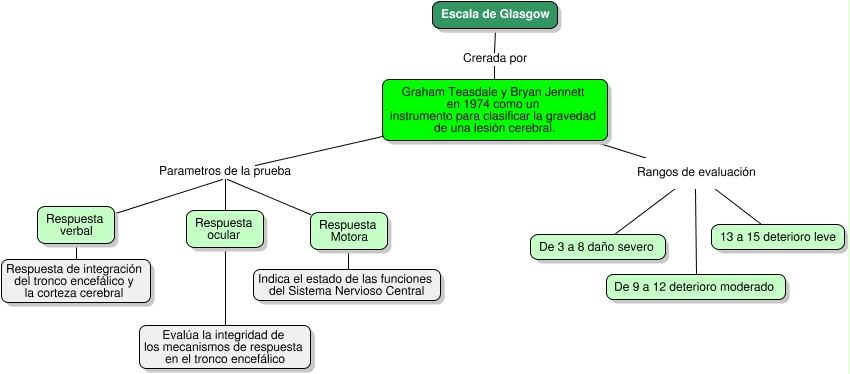 This Concept Map, created with IHMC CmapTools, has information related to: Glasgow, Respuesta verbal Parametros de la prueba Respuesta ocular, Graham Teasdale y Bryan Jennett en 1974 como un instrumento para clasificar la gravedad de una lesión cerebral. Parametros de la prueba Respuesta ocular, Respuesta verbal Respuesta de integración del tronco encefálico y la corteza cerebral, 13 a 15 deterioro leve Rangos de evaluación De 3 a 8 daño severo, Respuesta ocular Evalúa la integridad de los mecanismos de respuesta en el tronco encefálico, De 9 a 12 deterioro moderado Rangos de evaluación De 3 a 8 daño severo, Respuesta Motora Parametros de la prueba Respuesta ocular, Escala de Glasgow Crerada por Graham Teasdale y Bryan Jennett en 1974 como un instrumento para clasificar la gravedad de una lesión cerebral., Respuesta Motora Indica el estado de las funciones del Sistema Nervioso Central, Graham Teasdale y Bryan Jennett en 1974 como un instrumento para clasificar la gravedad de una lesión cerebral. Rangos de evaluación De 3 a 8 daño severo