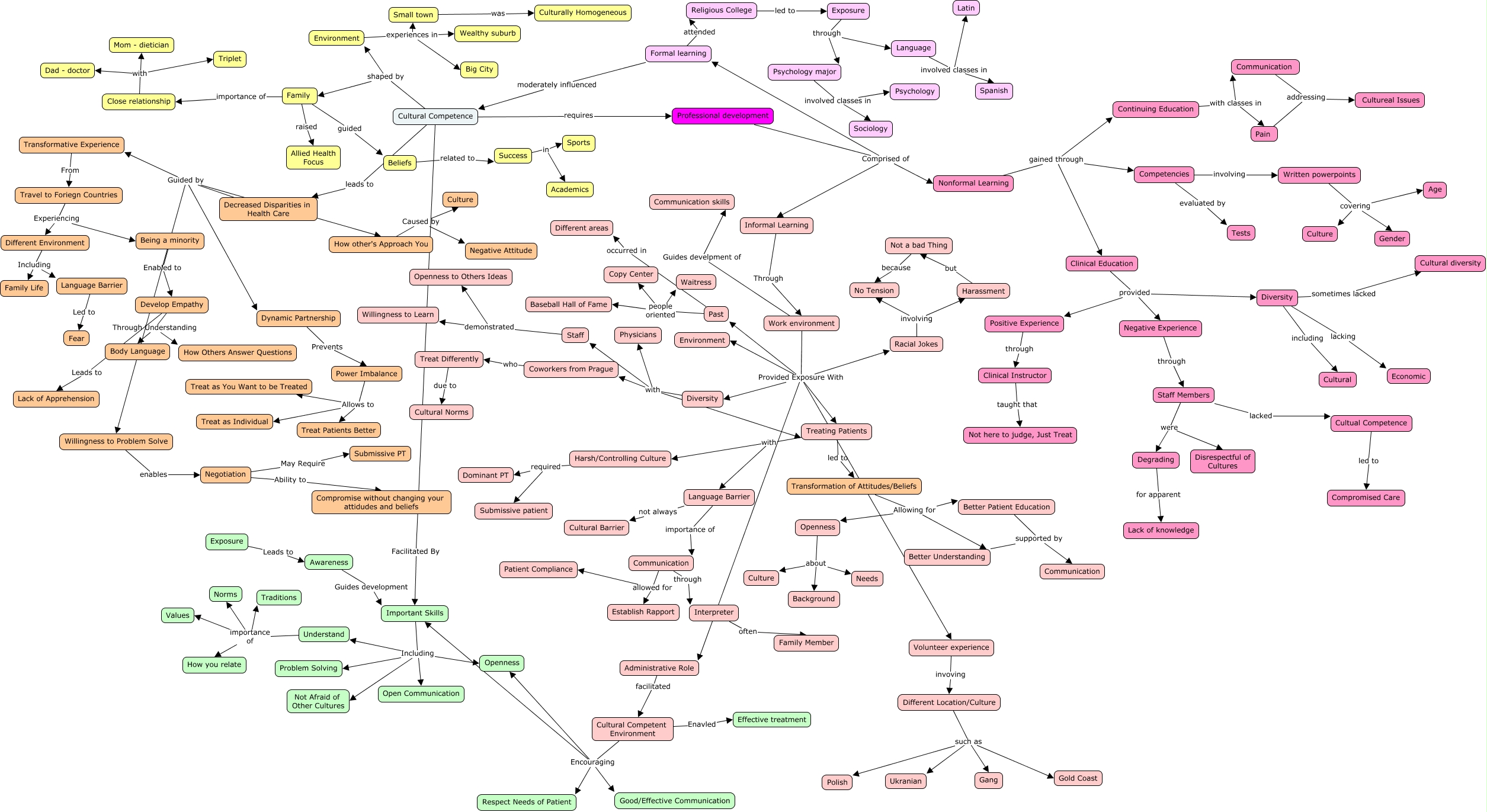 This Concept Map, created with IHMC CmapTools, has information related to: Individual-Teaching-Learnng-Societal-Cultural in Workplace, Dynamic Partnership Prevents Power Imbalance, Environment experiences in Small town, Transformation of Attitudes/Beliefs Allowing for Better Patient Education, Work environment Guides develpment of Communication skills, Exposure Leads to Awareness, Staff Members lacked Cultual Competence, Work environment Provided Exposure With Environment, Cultural Competence shaped by Environment, How other's Approach You Caused by Negative Attitude, Negotiation Ability to Compromise without changing your attidudes and beliefs, Communication allowed for Patient Compliance, Competencies involving Written powerpoints, Cultural Competent Environment Encouraging Respect Needs of Patient, Understand importance of Traditions, Language involved classes in Latin, Written powerpoints covering Age, Different Location/Culture such as Gang, Communication allowed for Establish Rapport, Written powerpoints covering Culture, Close relationship with Dad - doctor