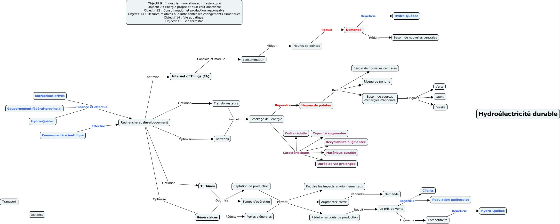 This Concept Map, created with IHMC CmapTools, has information related to: Hydroélectricité, Stockage de l'énergie Répondre Heures de pointes, consommation Mitiger Heures de pointes, Recherche et développement Optimise Batteries, Stockage de l'énergie Caractéristiques Durée de vie prolongée, Augmenter l'offre Répondre Demande, Heures de pointes Réduit Besoin de nouvelles centrales, Temps d'opération Permet Augmenter l'offre, Recherche et développement optimise Internet of Things (IA), Temps d'opération Permet Réduire les impacts envrionnementaux, Recherche et développement Optimise Turbines, Génératrices Optimise Temps d'opération, Communauté scientifique Effectue Recherche et développement, Besoin de sources d'énergies d'appoints Origines Fossile, Internet of Things (IA) Contrôle et module consommation, Stockage de l'énergie Caractéristiques Coûts réduits, Recherche et développement Optimise Génératrices, Stockage de l'énergie Caractéristiques Capacité augmentée, Pertes d'énergies Permet Augmenter l'offre, Turbines Optimise Captation de production, Pertes d'énergies Permet Réduire les impacts envrionnementaux